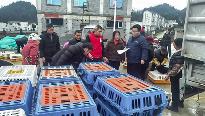 近日,在古蔺县龙山镇向田村党群服务中心,泸州老窖股份有限公司上半年免费发放给该村的5000只鸡苗出栏了,乌蒙山供销合作社入村收购,扶贫鸡苗鼓起了该村群众的“腰包”。