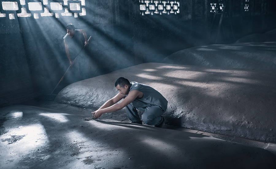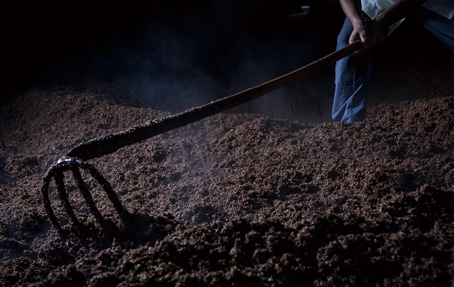? ? 在原酒酿造过程中,将母糟从窖池中起运出来,堆砌成四方形,表面均匀铺上糠壳,避免酒精物质过快挥发。在碎粮之后,再通过有技巧的挖糟,使母糟和粮食能按比例均匀拌和。