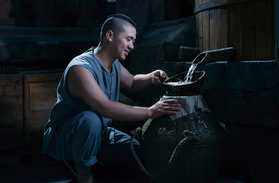? ? ?在蒸馏取酒过程中,流出的酒,由于乙醇与水的表面张力不同,不同的酒度(酒精浓度)呈现出不同大小的液珠(俗称酒花),而且停留的时间长短不同。在图五中,匠人正是凭此判断酒精浓度,以掌握取酒时间。