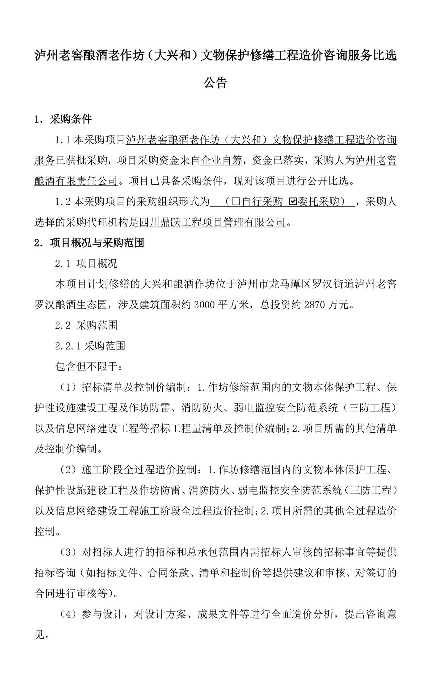 泸州老窖酿酒老作坊(大兴和)文物保护修缮工程造价咨询服务比选公告