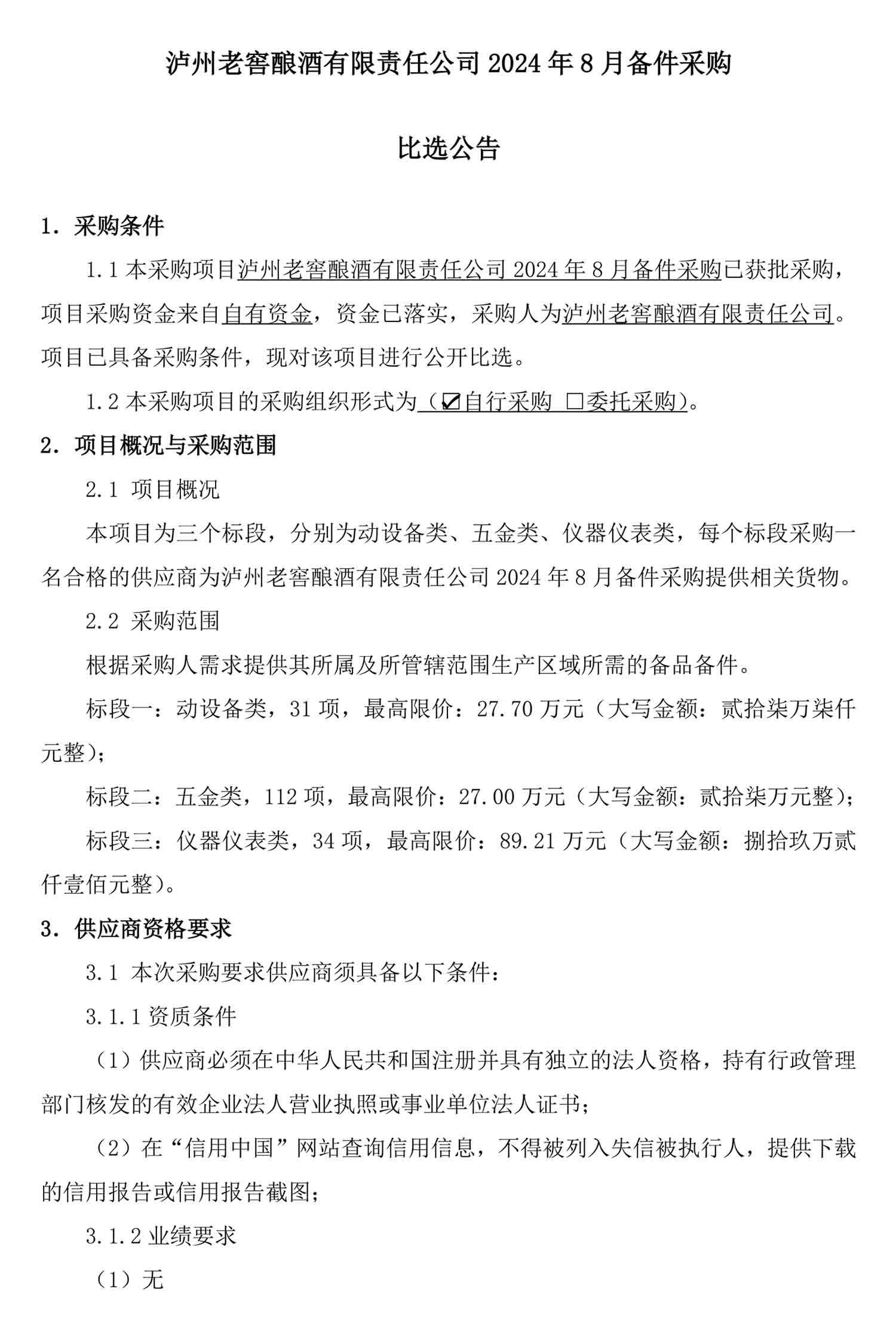 泸州老窖酿酒有限责任公司2024年8月备件采购比选公告