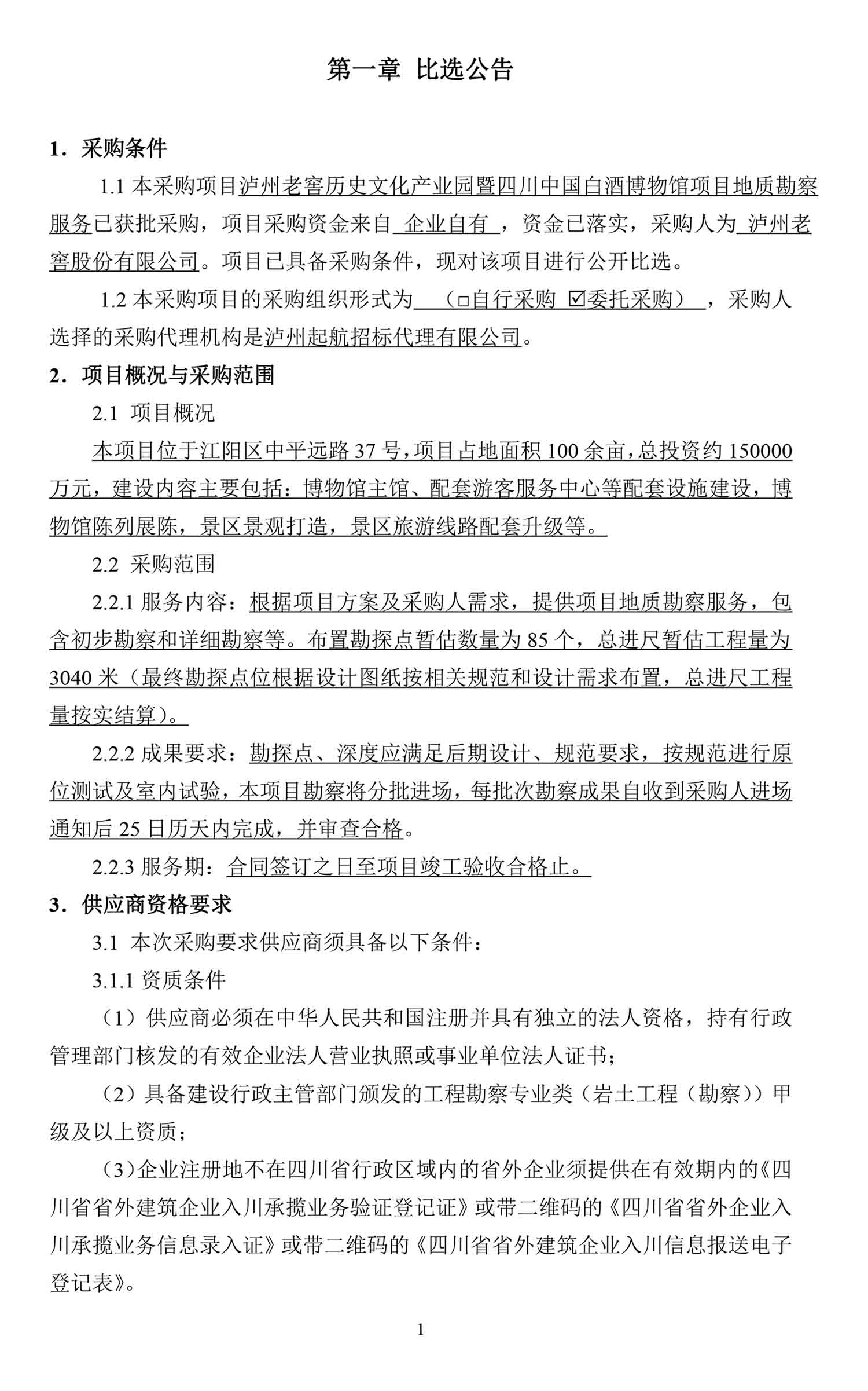 泸州老窖历史文化产业园暨四川中国白酒博物馆项目地质勘察服务比选公告