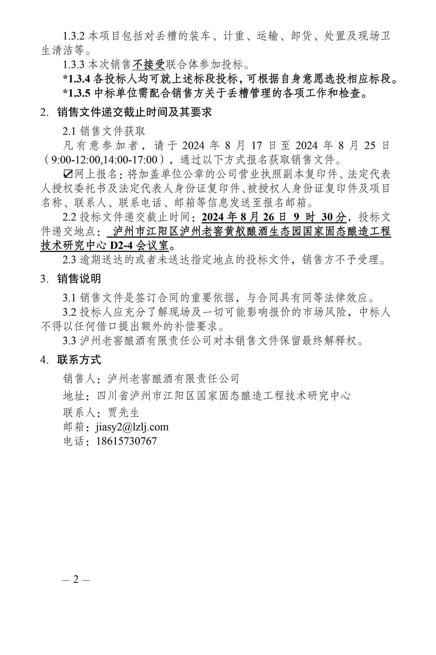 泸州老窖酿酒有限责任公司丢糟销售项目(第二次)招标公告