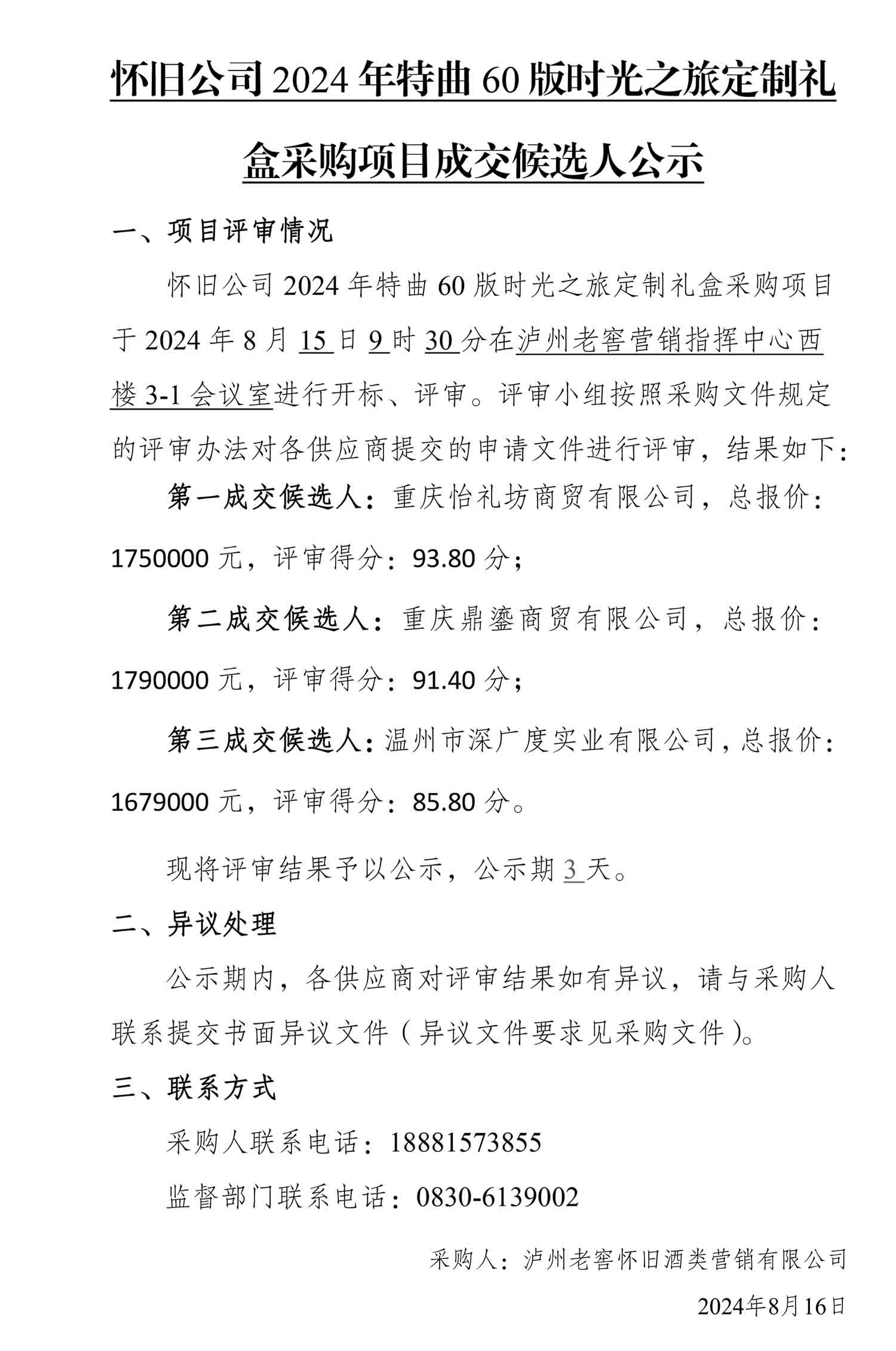 怀旧公司2024年特曲60版时光之旅定制礼盒采购项目成交候选人公示