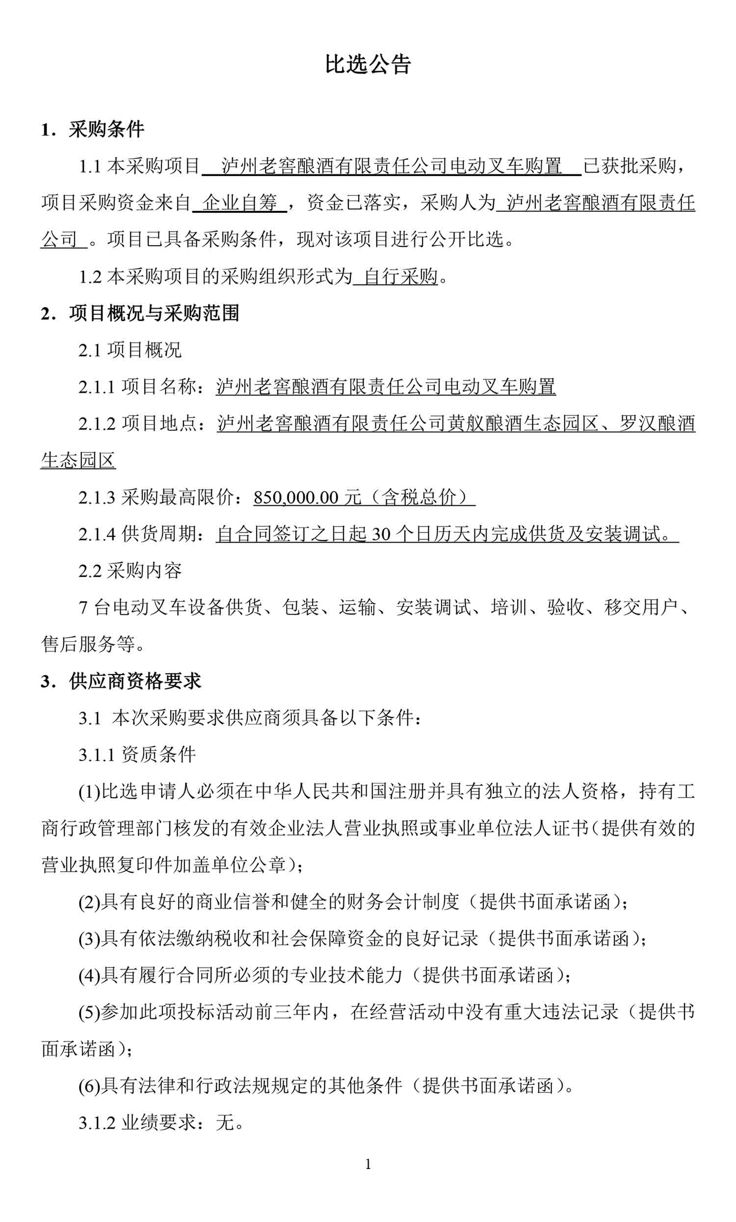 泸州老窖酿酒有限责任公司电动叉车购置比选公告