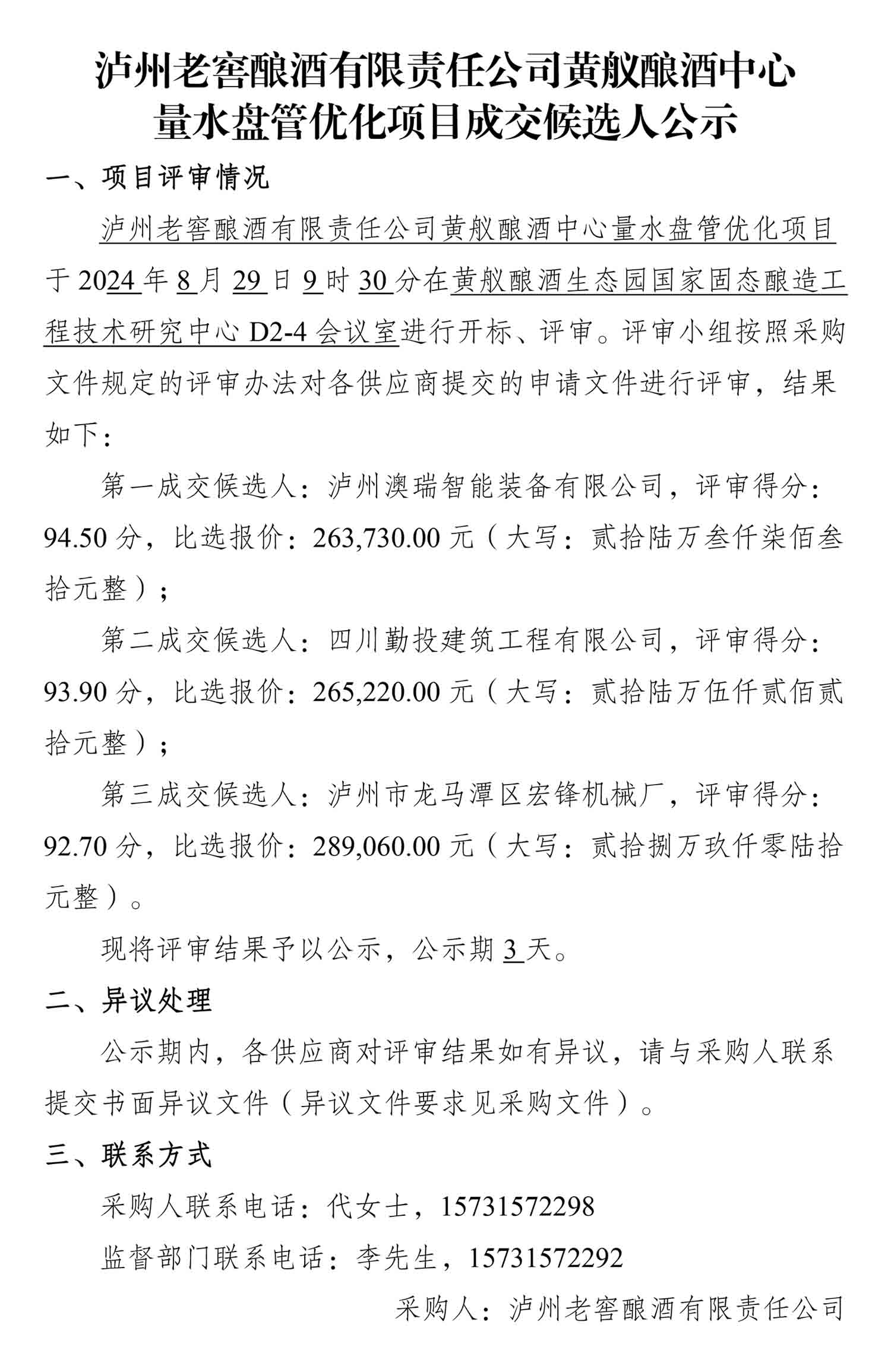 泸州老窖酿酒有限责任公司黄舣酿酒中心量水盘管优化项目成交候选人公示
