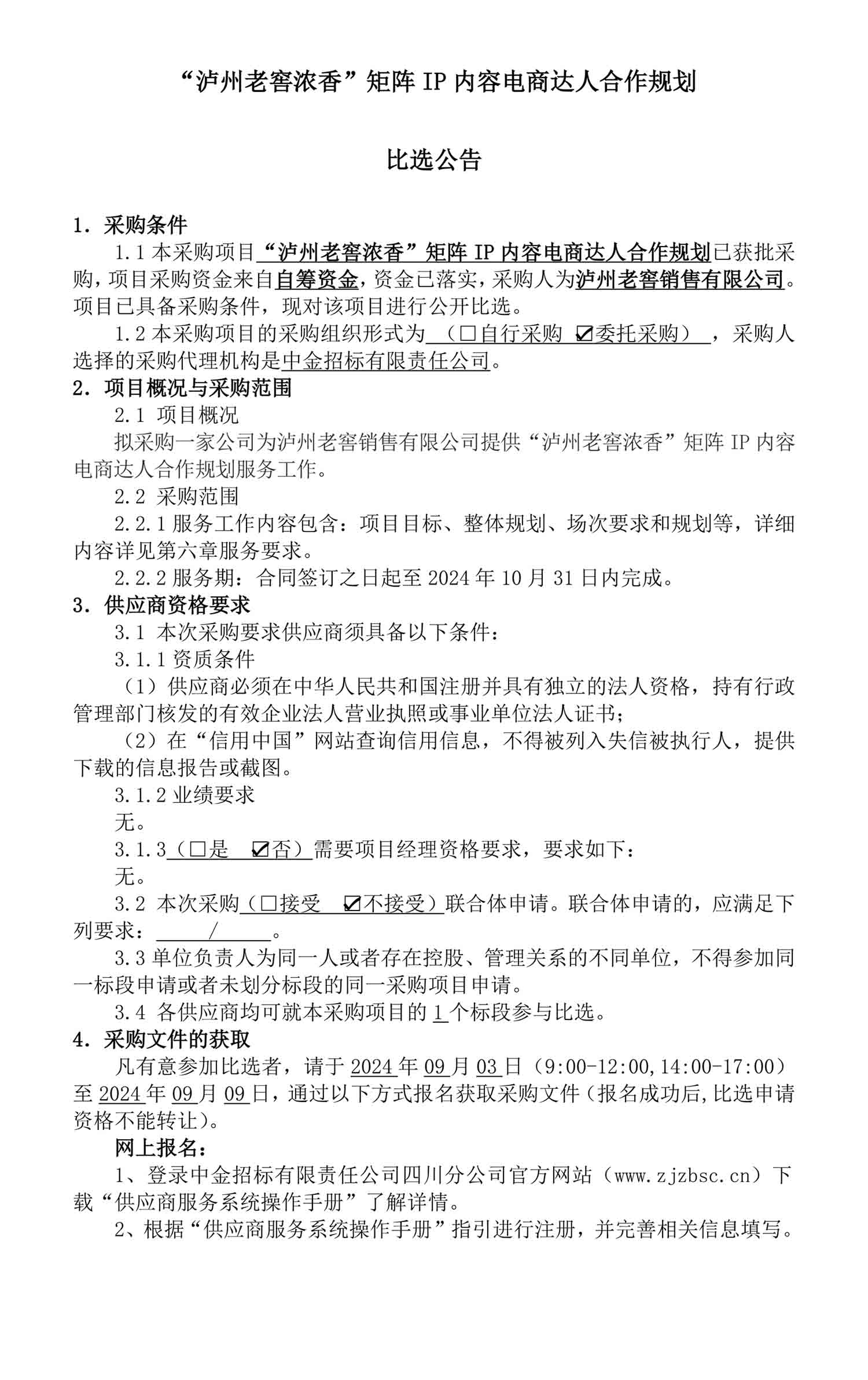 “泸州老窖浓香”矩阵IP内容电商达人合作规划比选公告