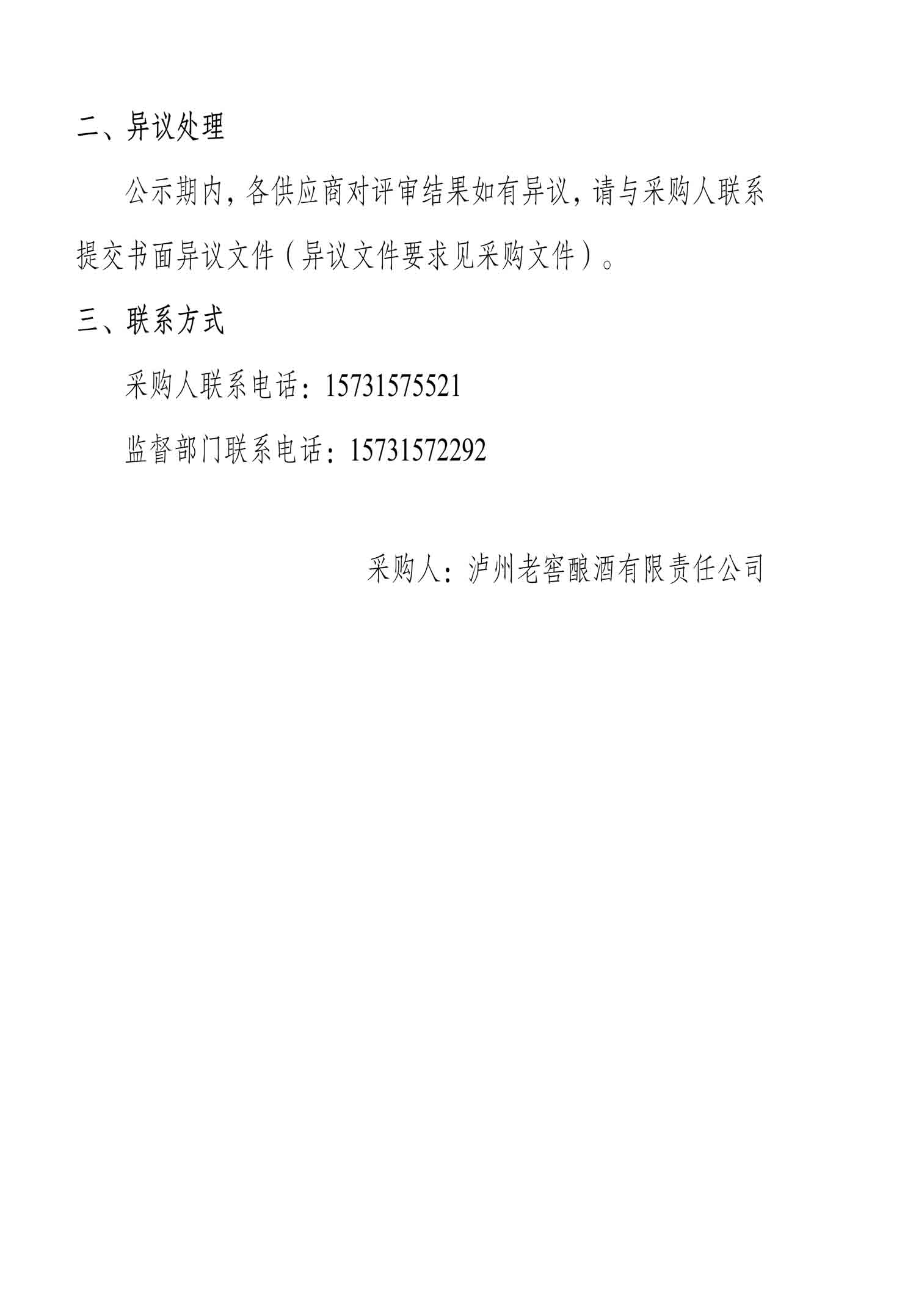 泸州老窖酿酒有限责任公司2024年8月备件采购(第二次)成交候选人公示