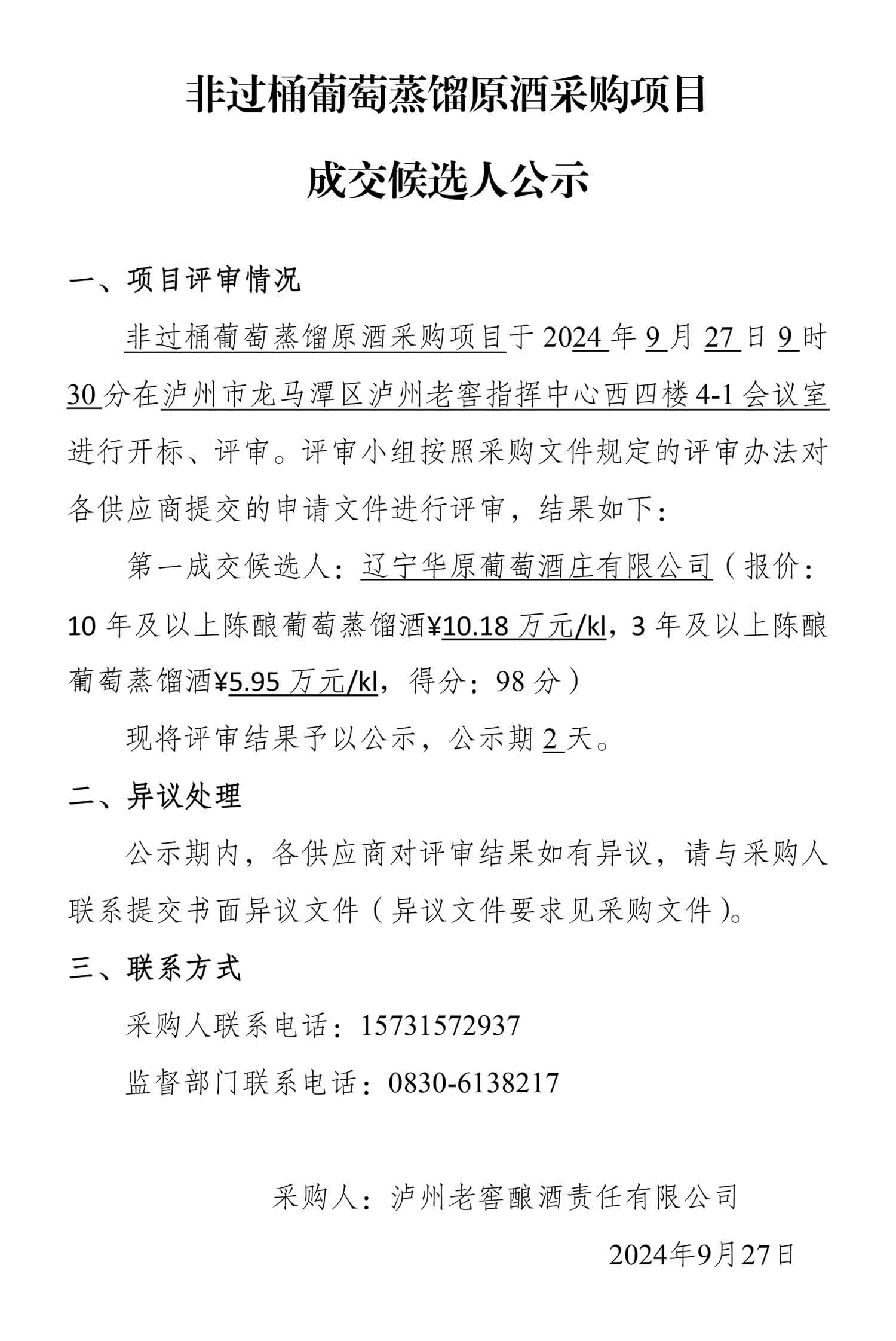 非过桶葡萄蒸馏原酒采购项目成交候选人公示