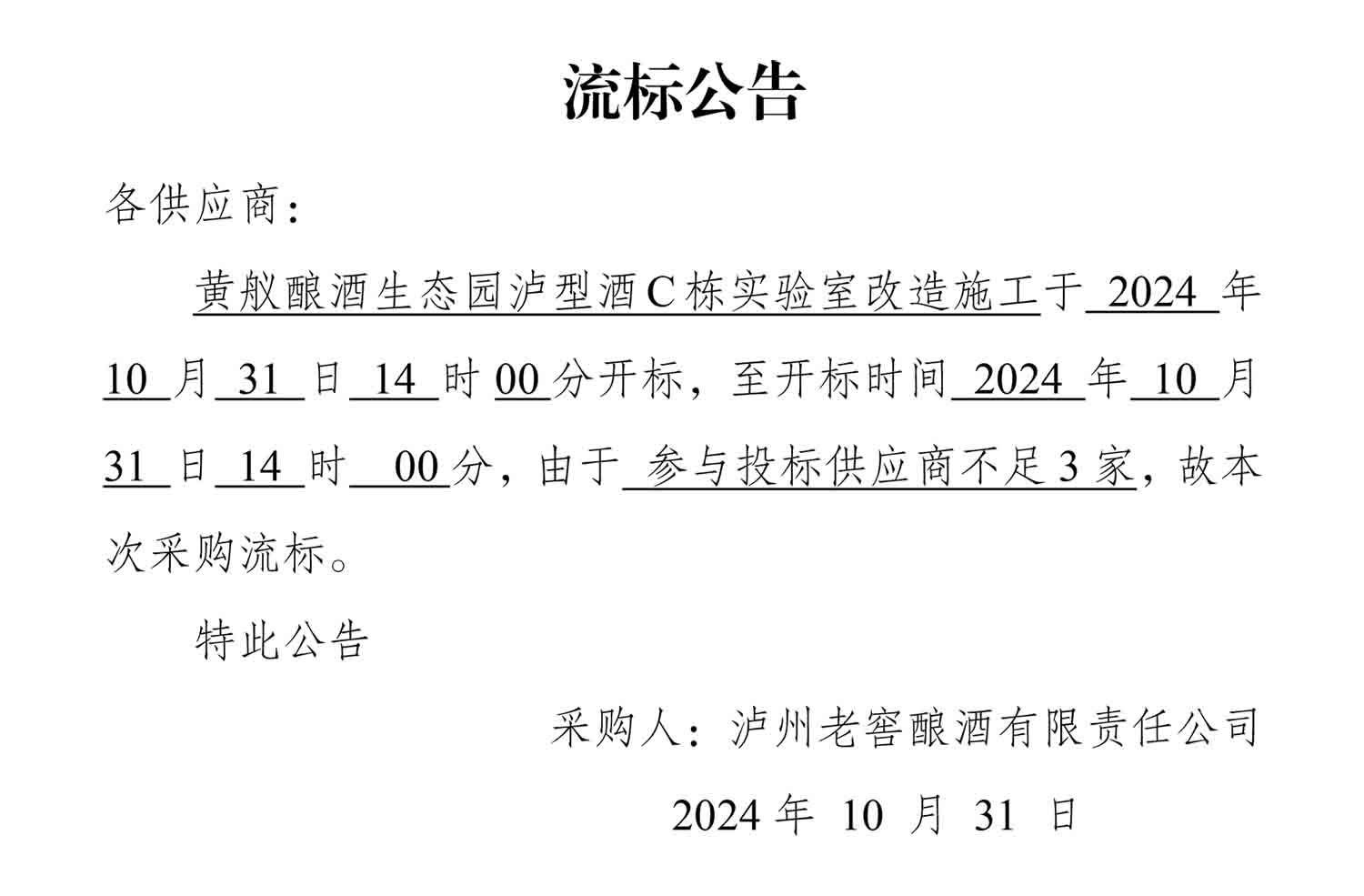 黄舣酿酒生态园泸型酒C栋实验室改造施工流标公告