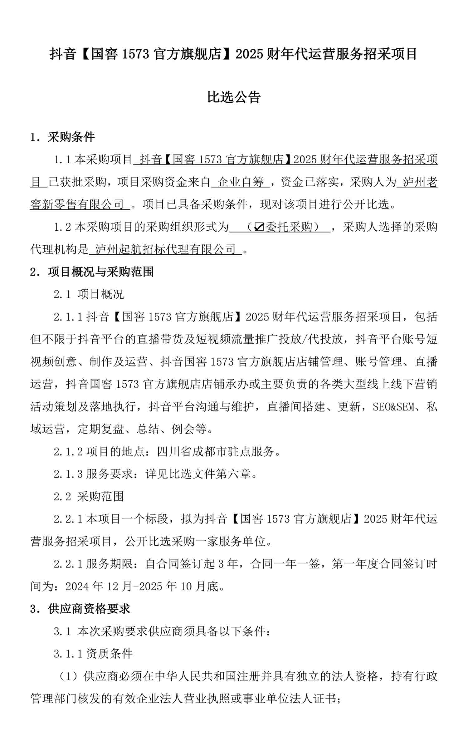 抖音国窖1573官方旗舰店2025财年代运营服务招采项目比选公告