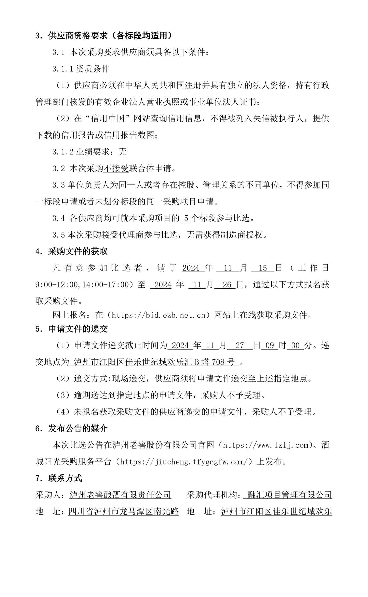 泸州老窖酿酒有限责任公司2024年11月备件采购比选公告