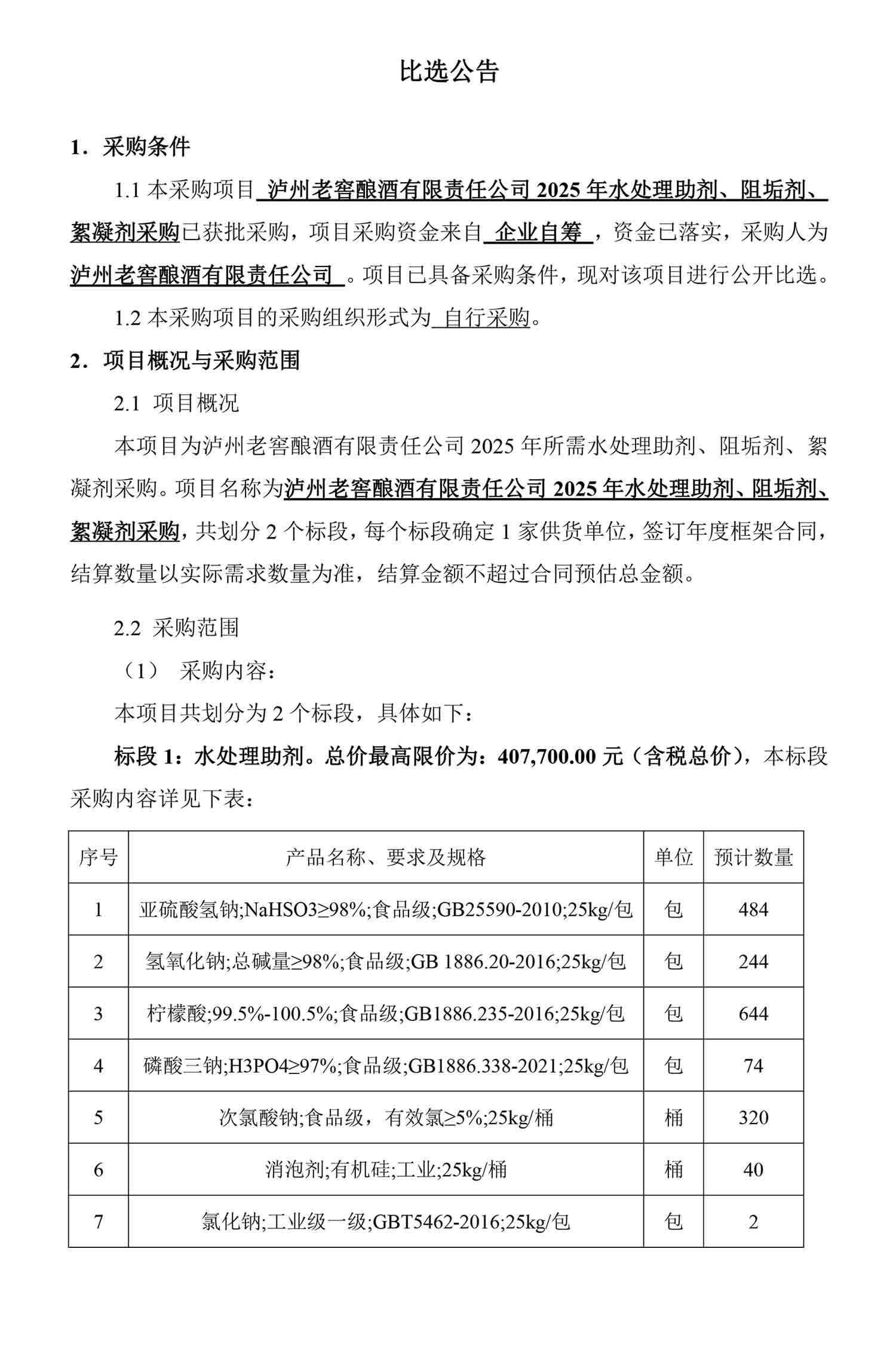 泸州老窖酿酒有限责任公司2025年水处理助剂、阻垢剂、絮凝剂采购比选公告
