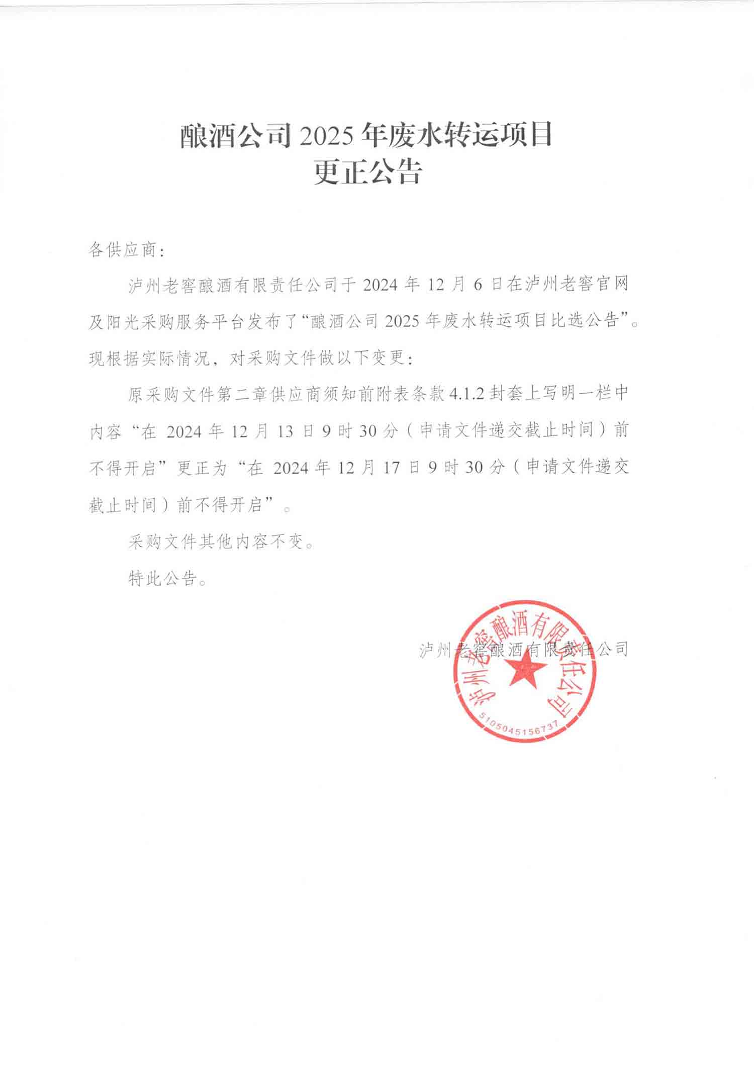 酿酒公司2025年废水转运项目更正公告