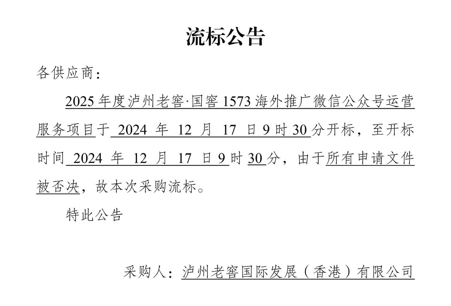 2025年度泸州老窖·国窖1573海外推广微信公众号运营服务项目流标公告