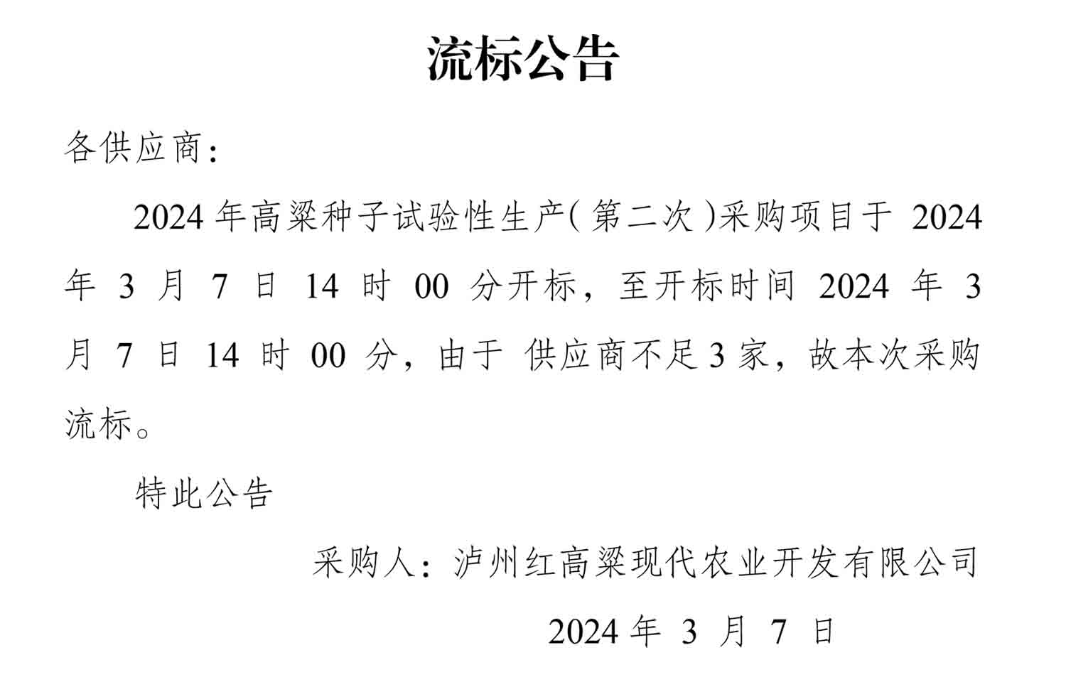2024年高粱种子试验性生产(第二次)采购流标公告