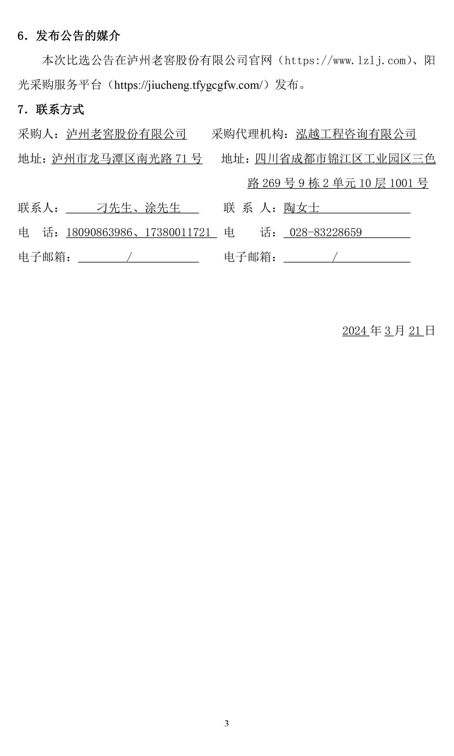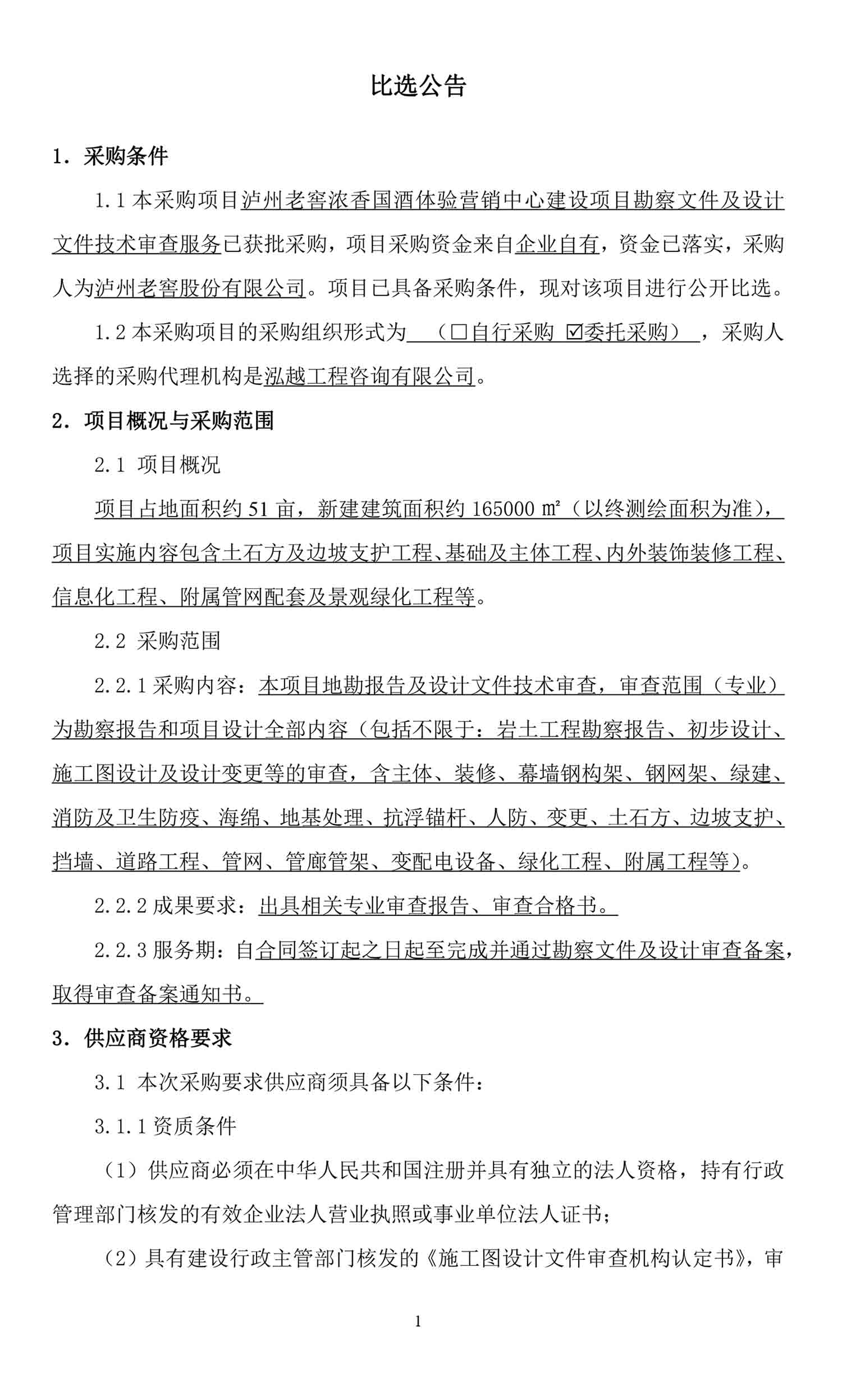 泸州老窖浓香国酒体验营销中心建设项目勘察文件及设计文件技术审查服务比选公告