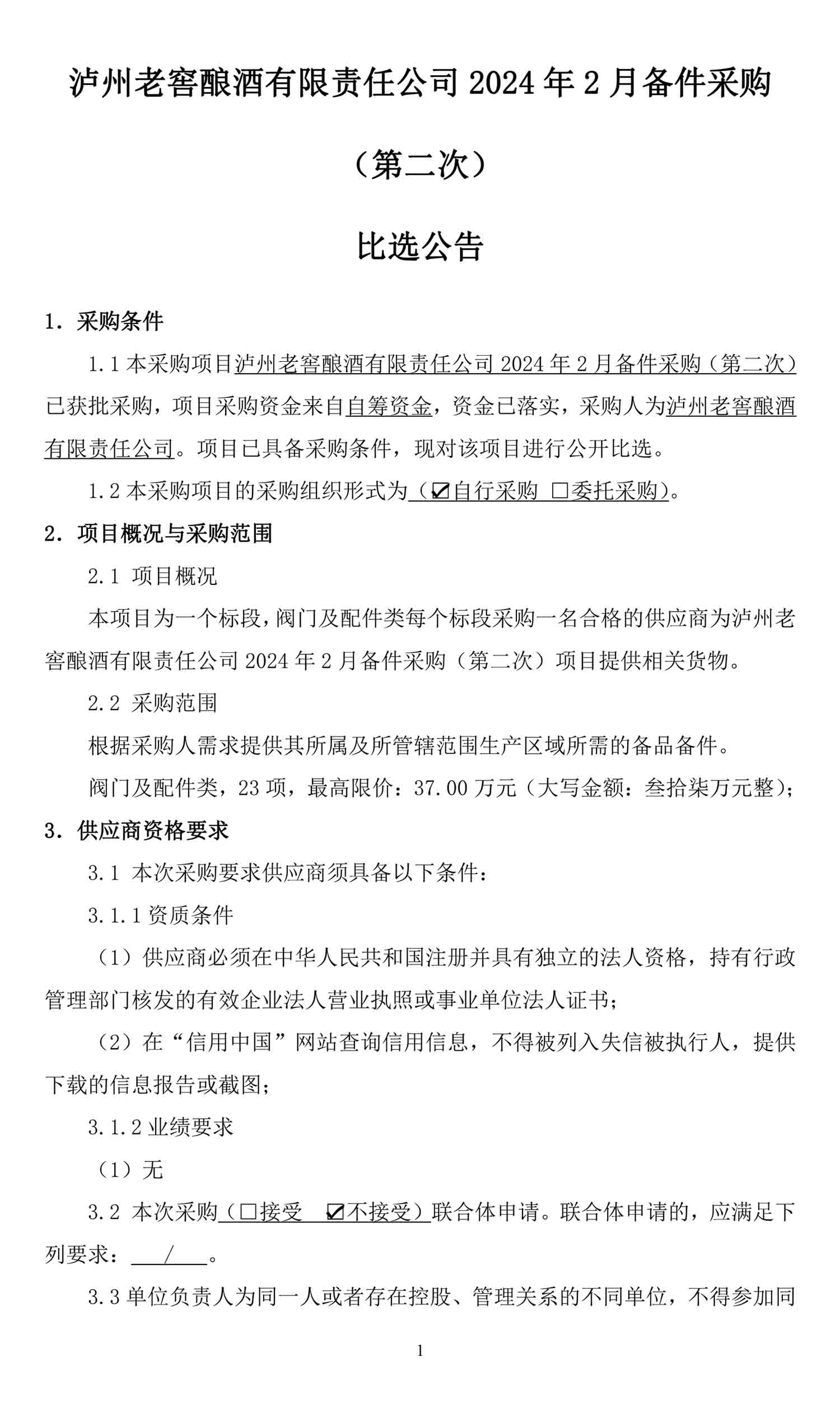 泸州老窖酿酒有限责任公司2024年2月备件采购(第二次)比选公告
