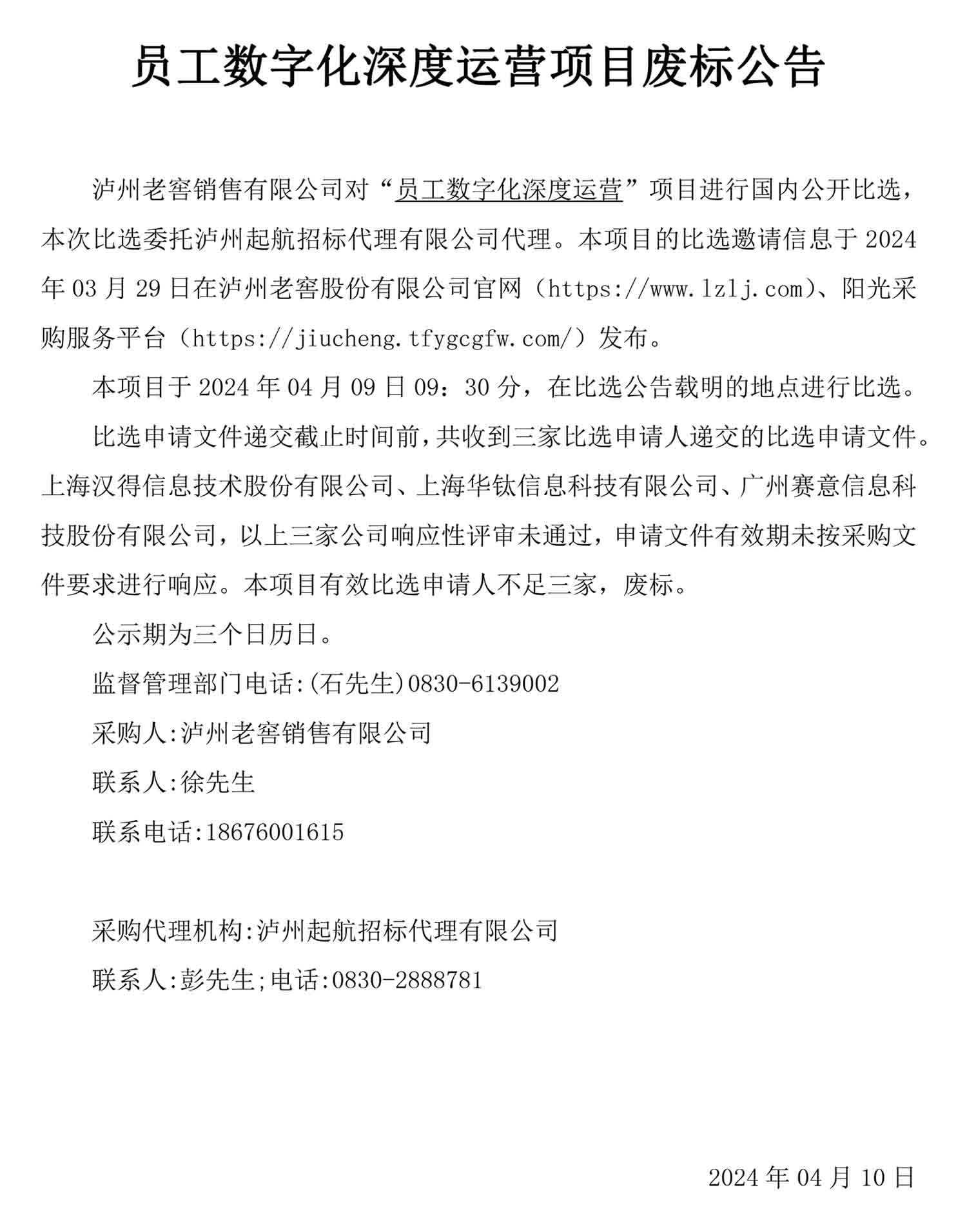 员工数字化深度运营项目废标公告