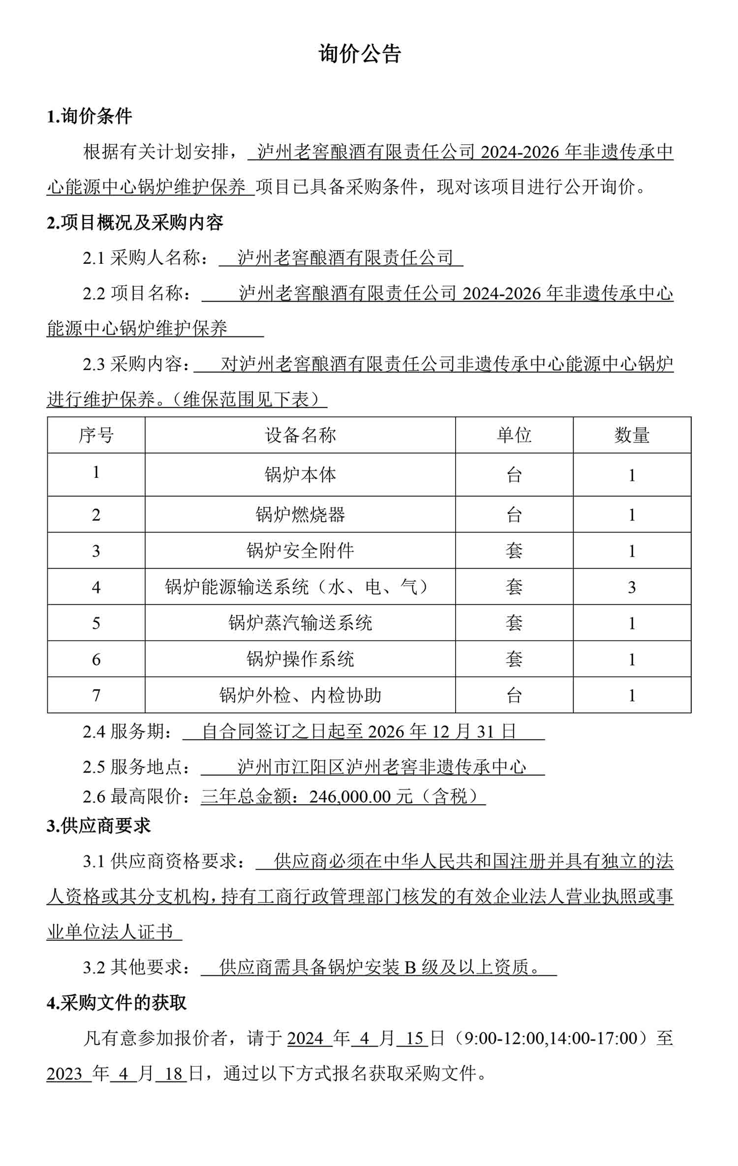 泸州老窖酿酒有限责任公司2024-2026年非遗传承中心能源中心锅炉维护保养询价公告