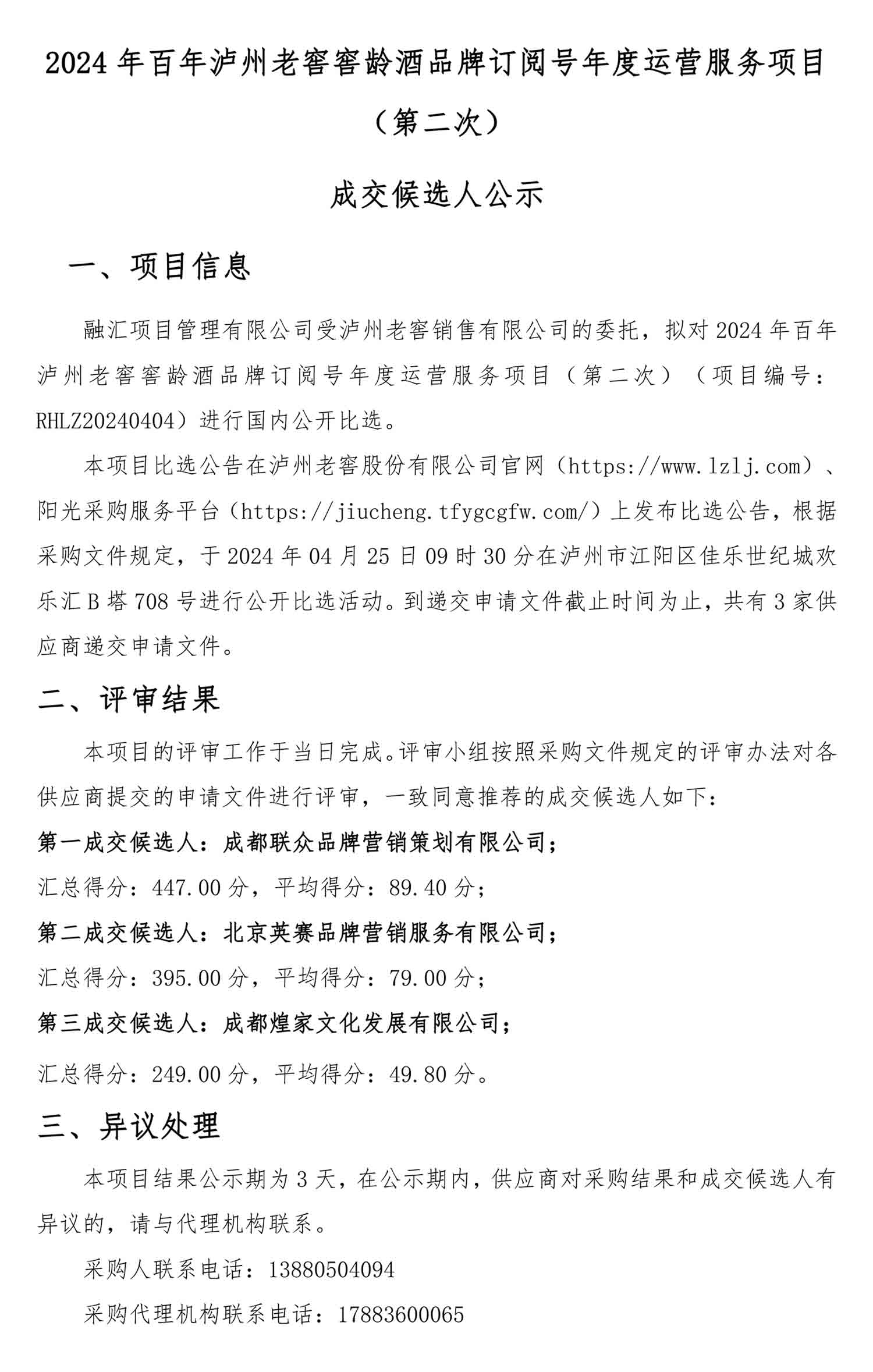 2024年百年泸州老窖窖龄酒品牌订阅号年度运营服务项目(第二次)成交候选人公示
