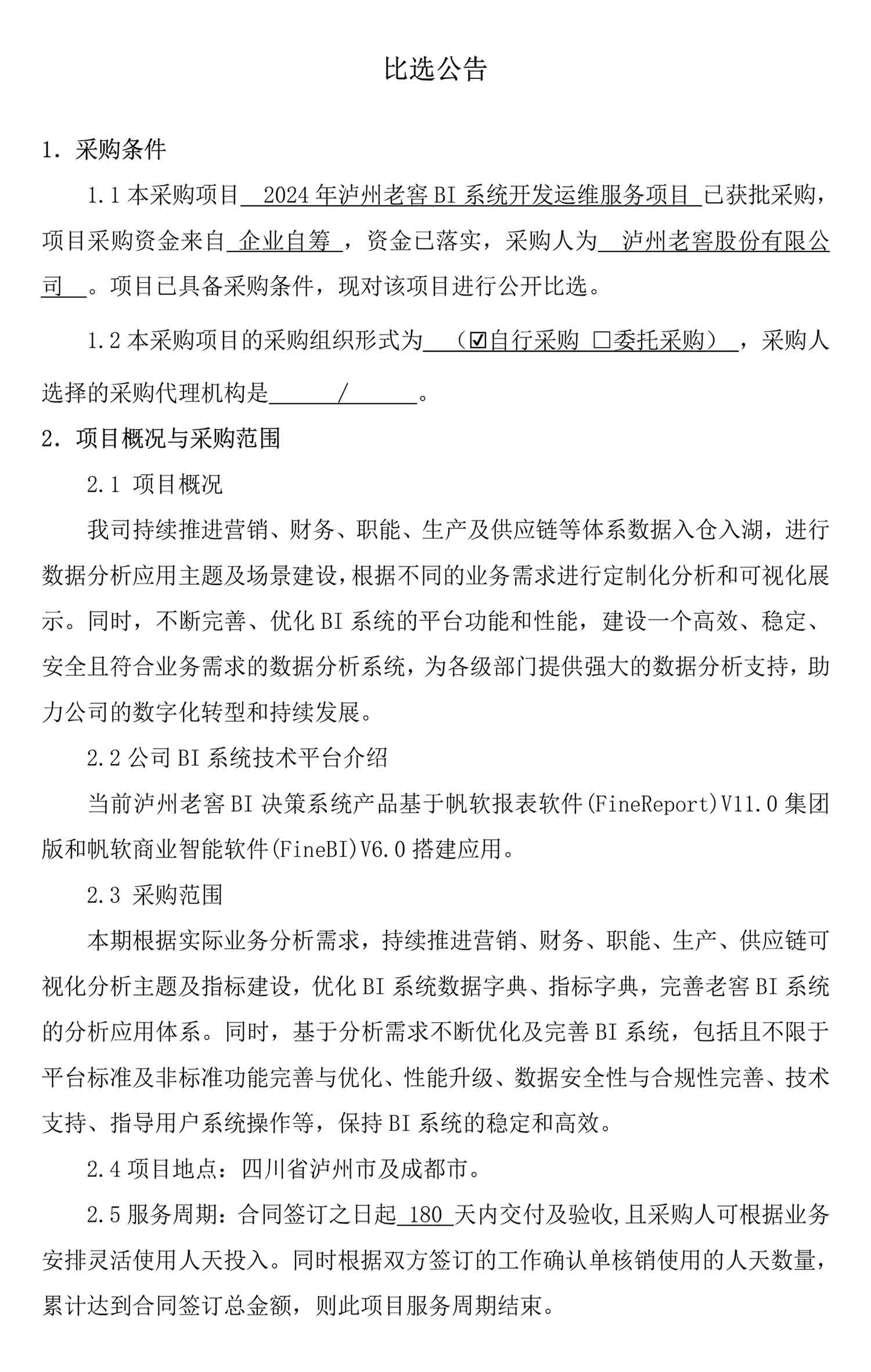 2024年泸州老窖BI系统开发运维服务项目比选公告