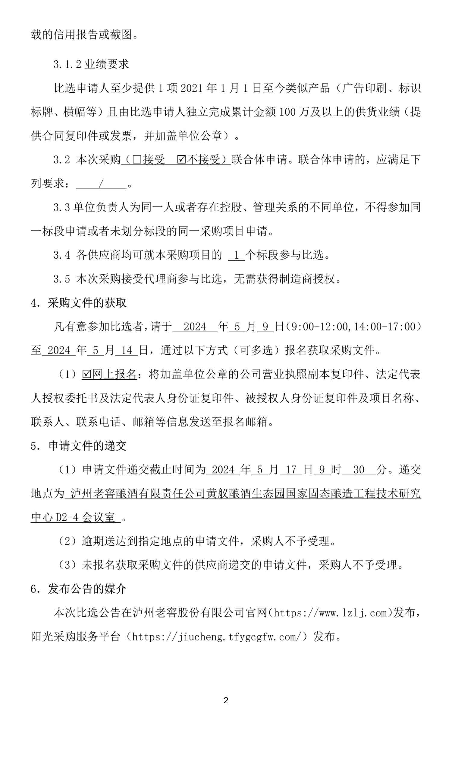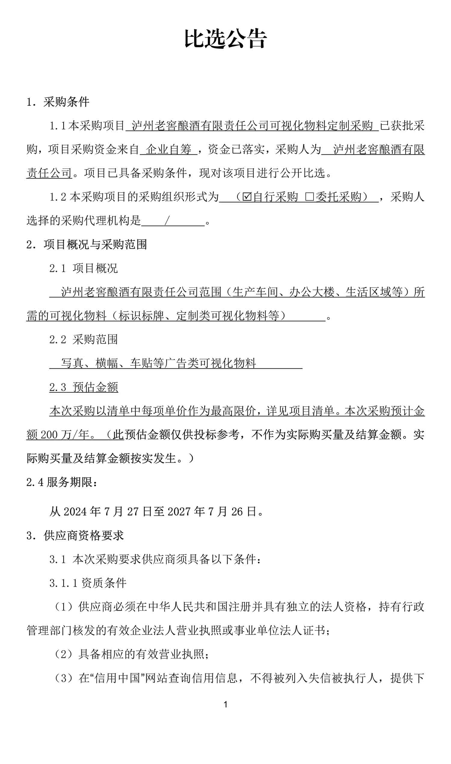 泸州老窖酿酒有限责任公司可视化物料定制采购项目比选公告