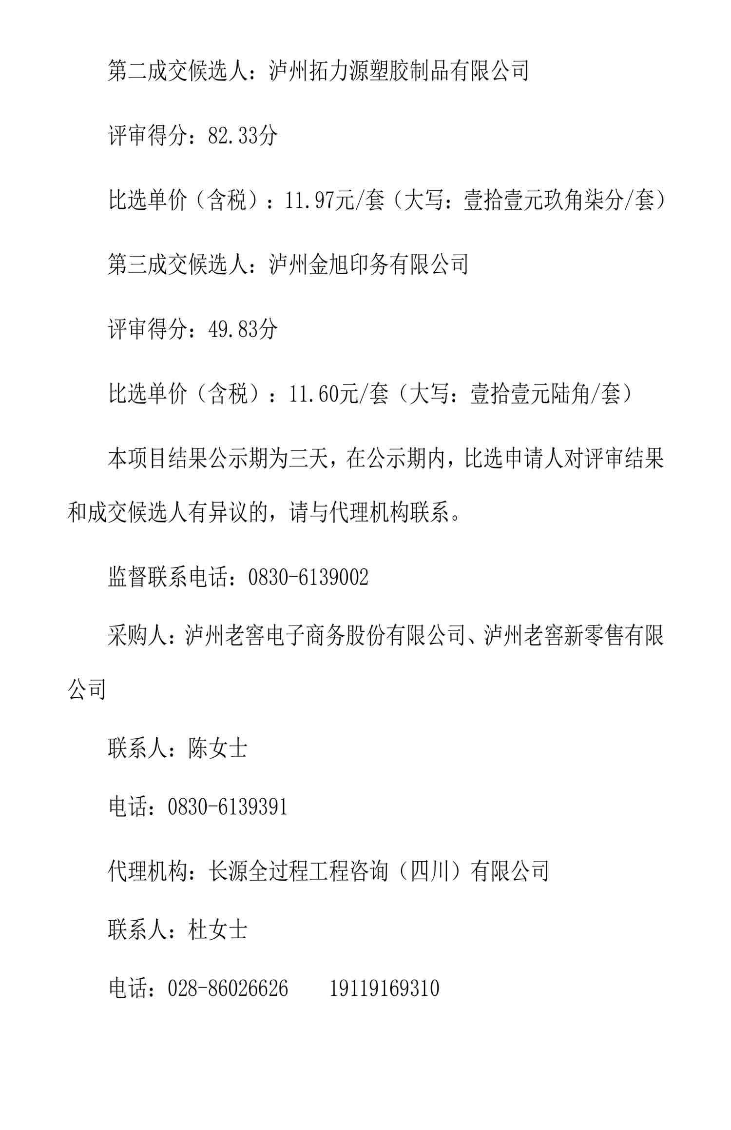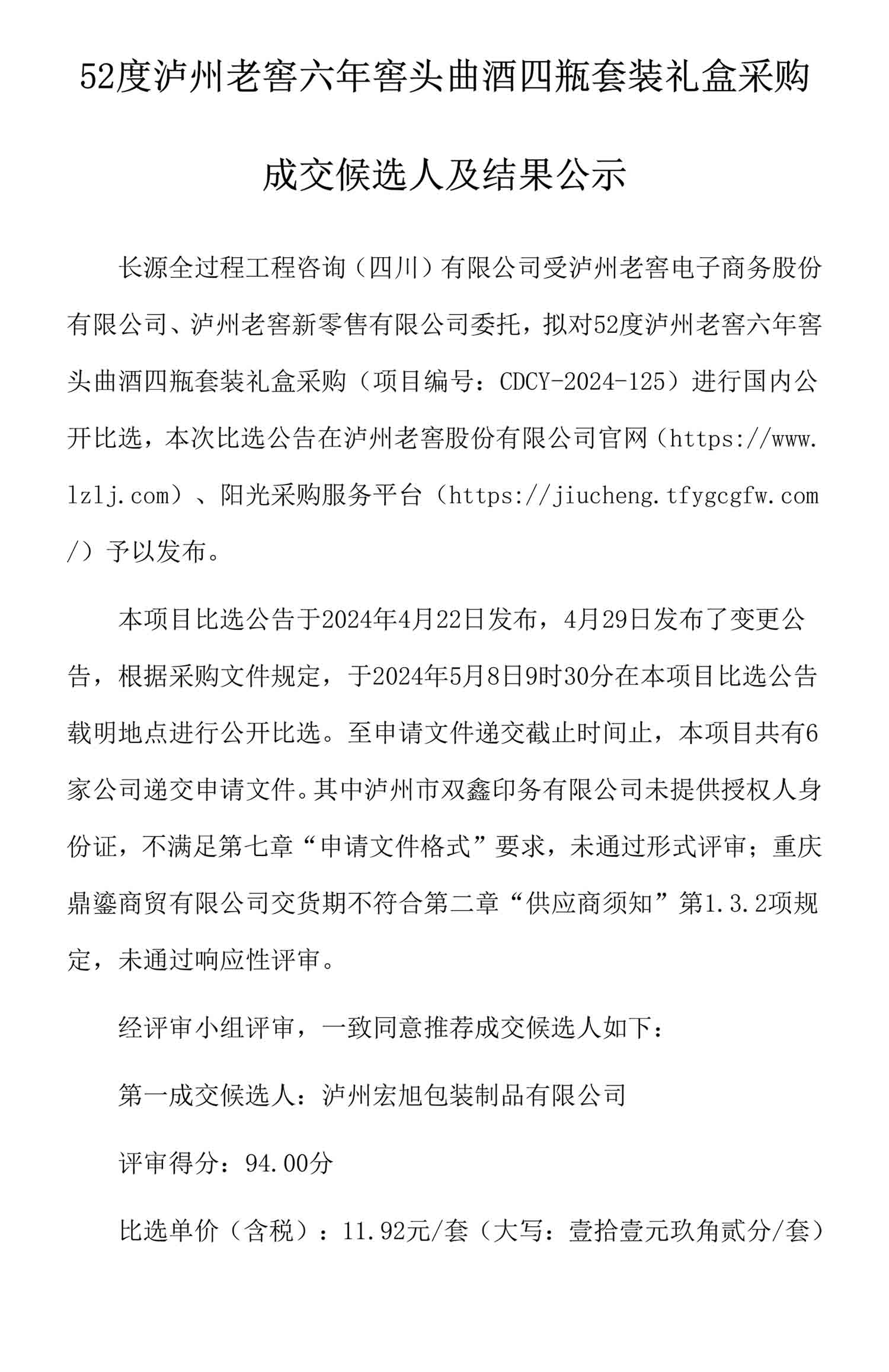 52度泸州老窖六年窖头曲酒四瓶套装礼盒采购成交候选人及结果公示