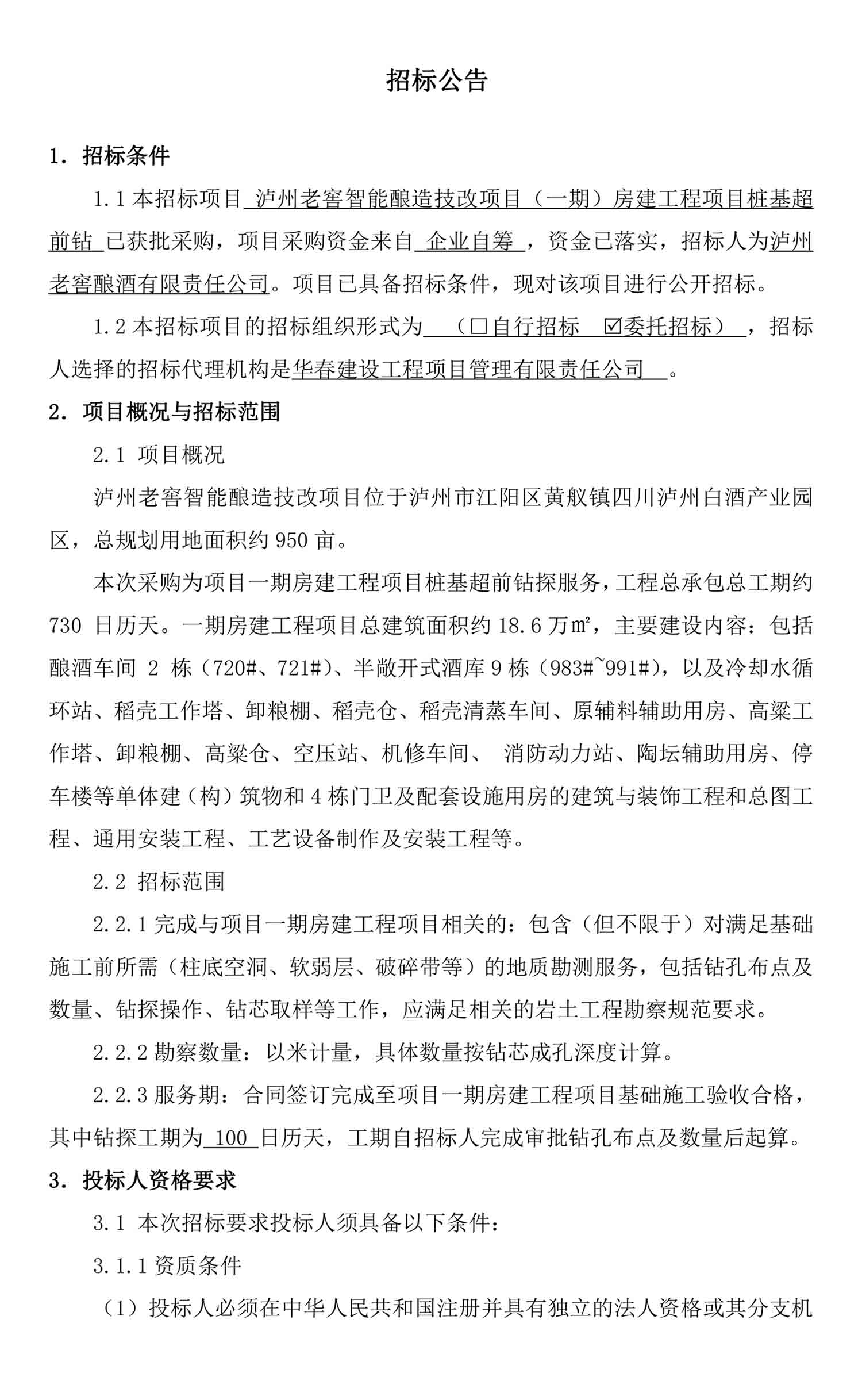 泸州老窖智能酿造技改项目(一期)房建工程项目桩基超前钻招标公告