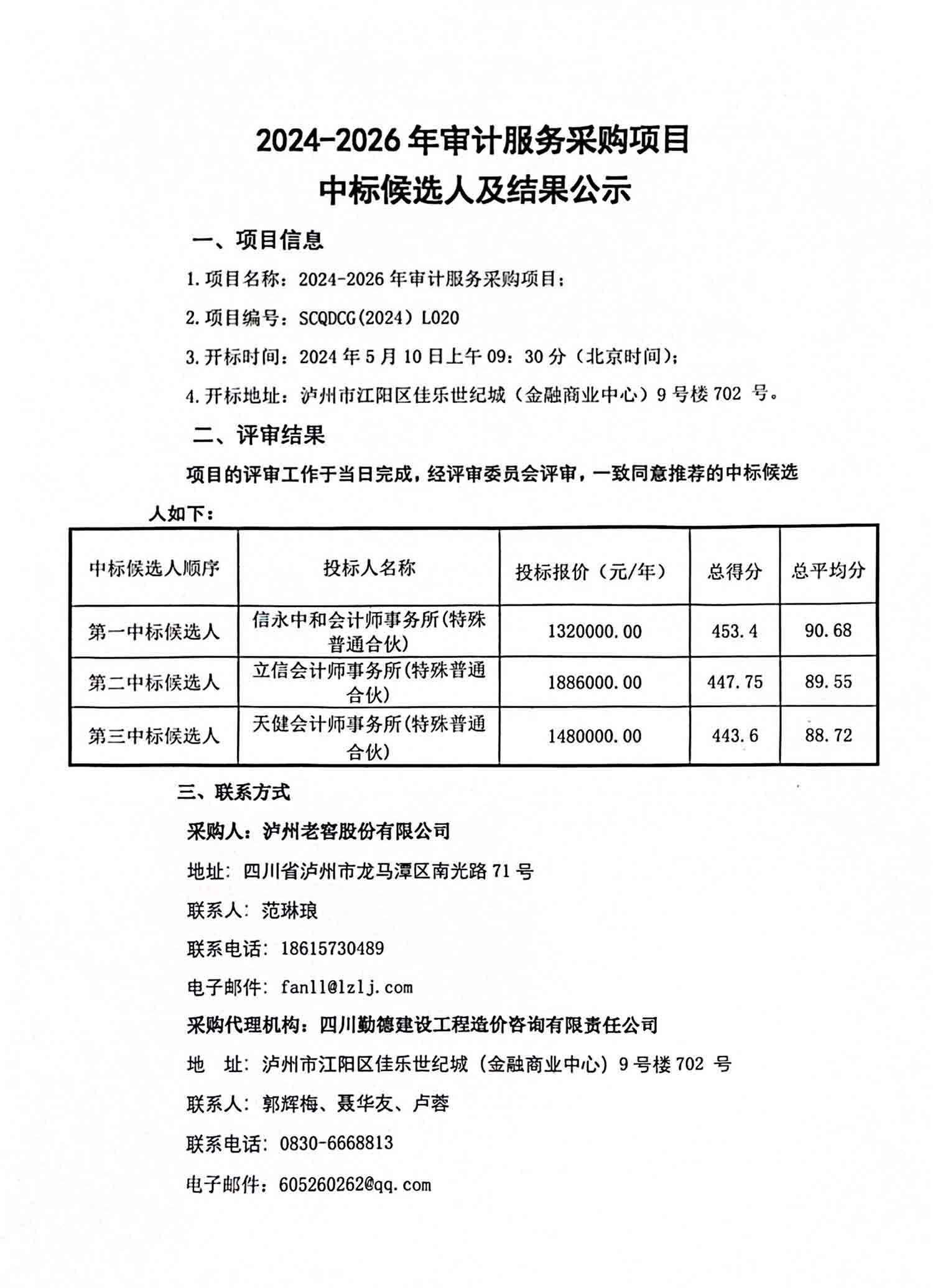 泸州老窖股份有限公司2024-2026年审计服务采购项目中标候选人及结果公示