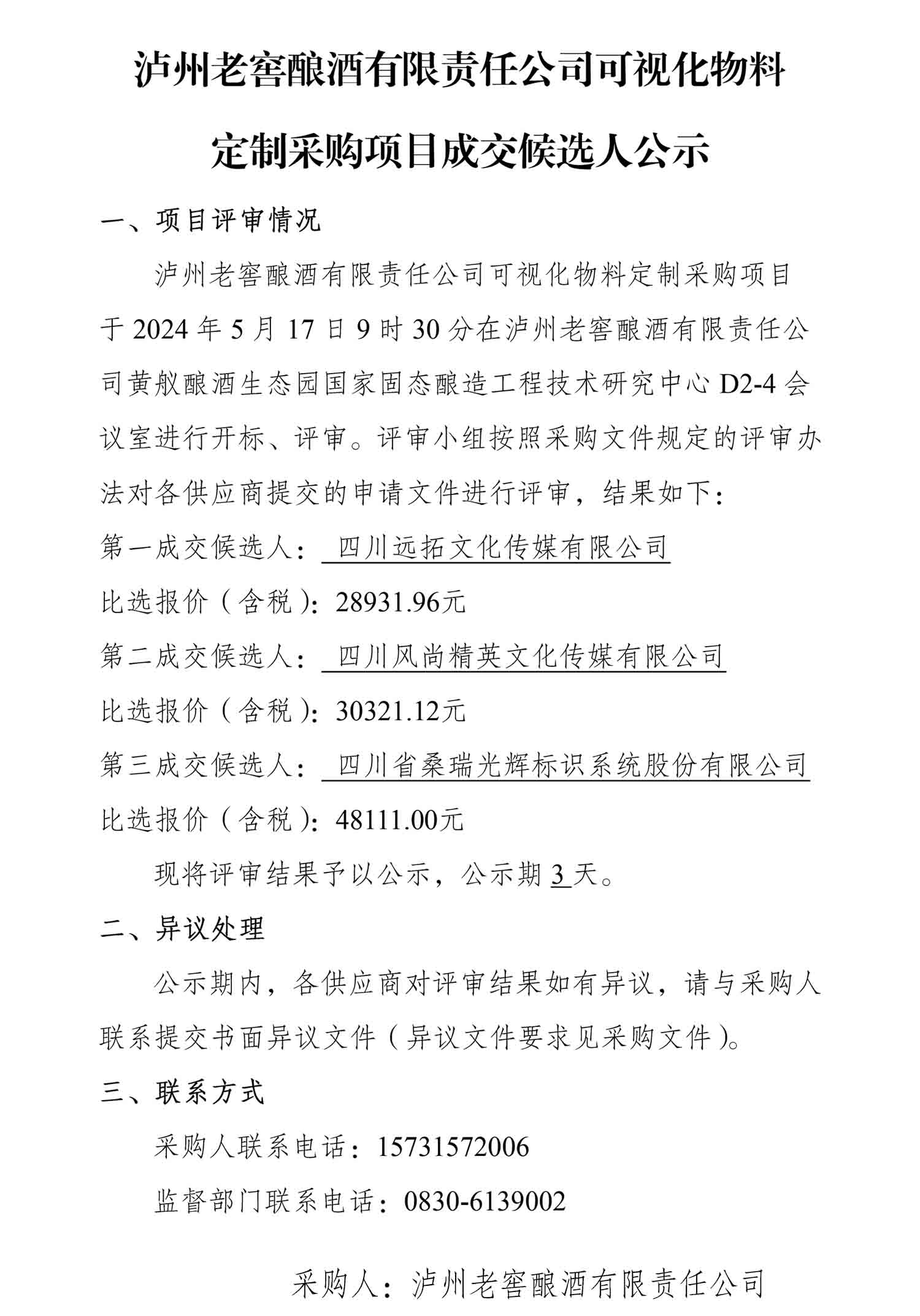 泸州老窖酿酒有限责任公司可视化物料定制采购项目成交候选人公示