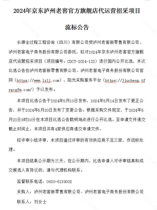 2024年京东泸州老窖官方旗舰店代运营招采项目流标公告