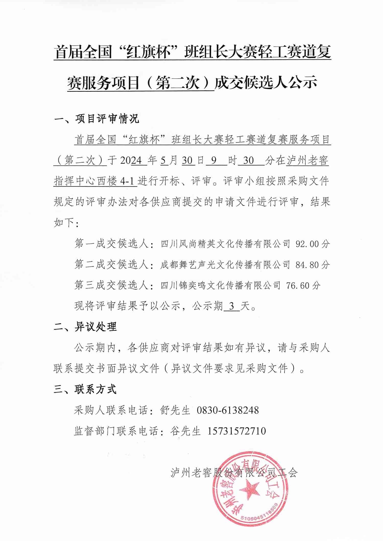 首届全国“红旗杯”班组长大赛轻工赛道复赛服务项目(第二次)成交候选人公示