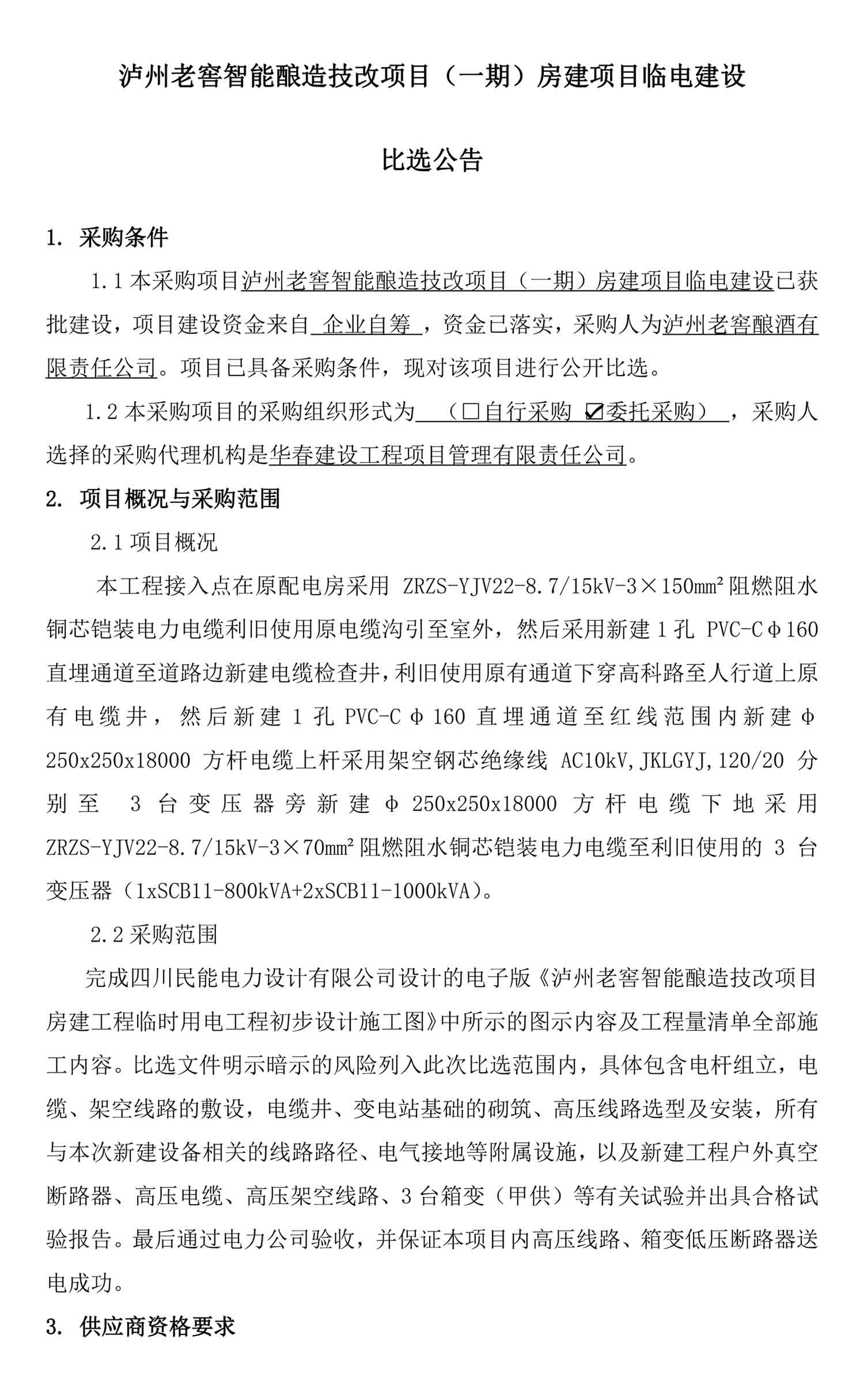 泸州老窖智能酿造技改项目(一期)房建项目临电建设比选公告