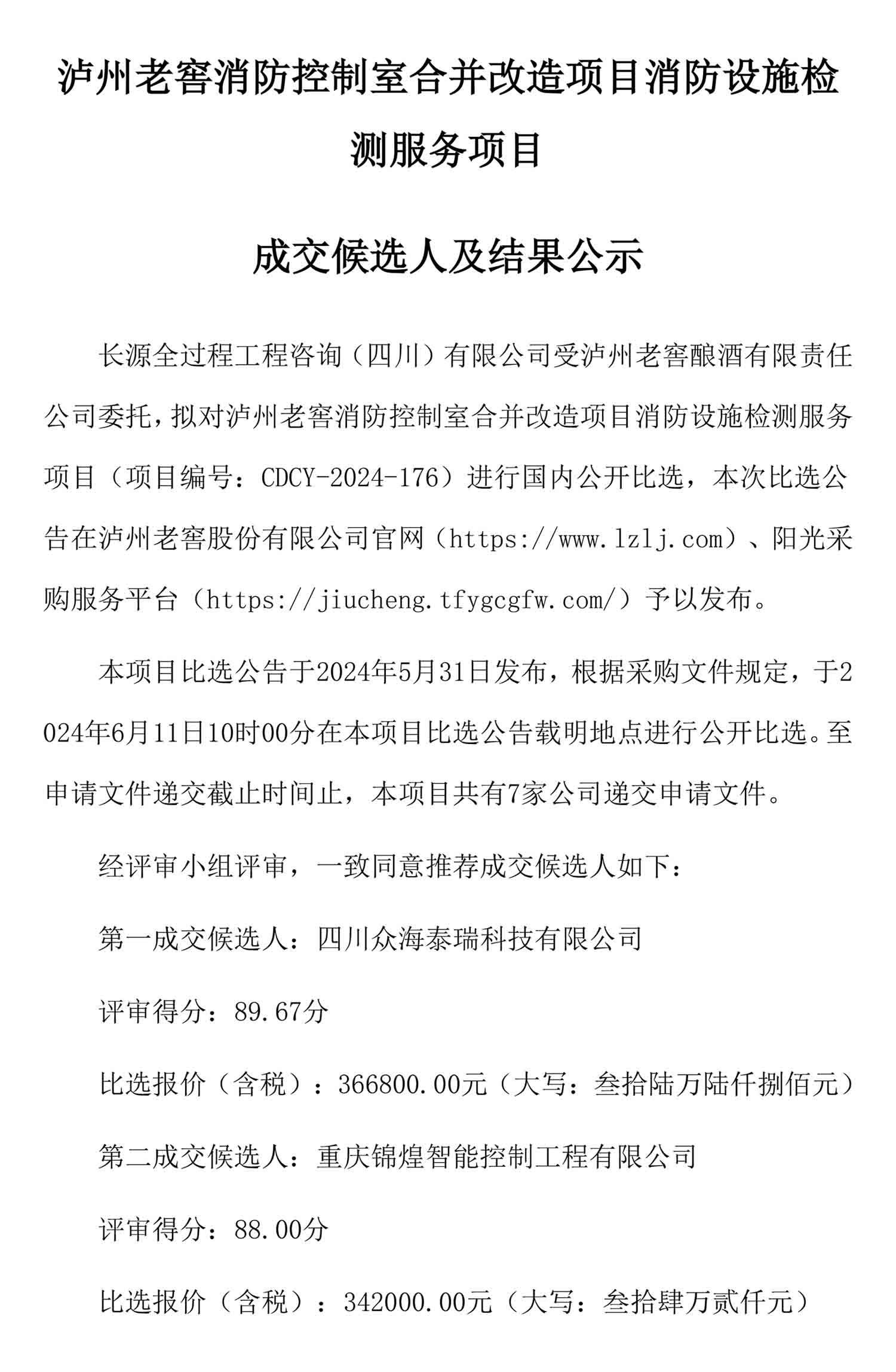 泸州老窖消防控制室合并改造项目消防设施检测服务项目成交候选人及结果公示
