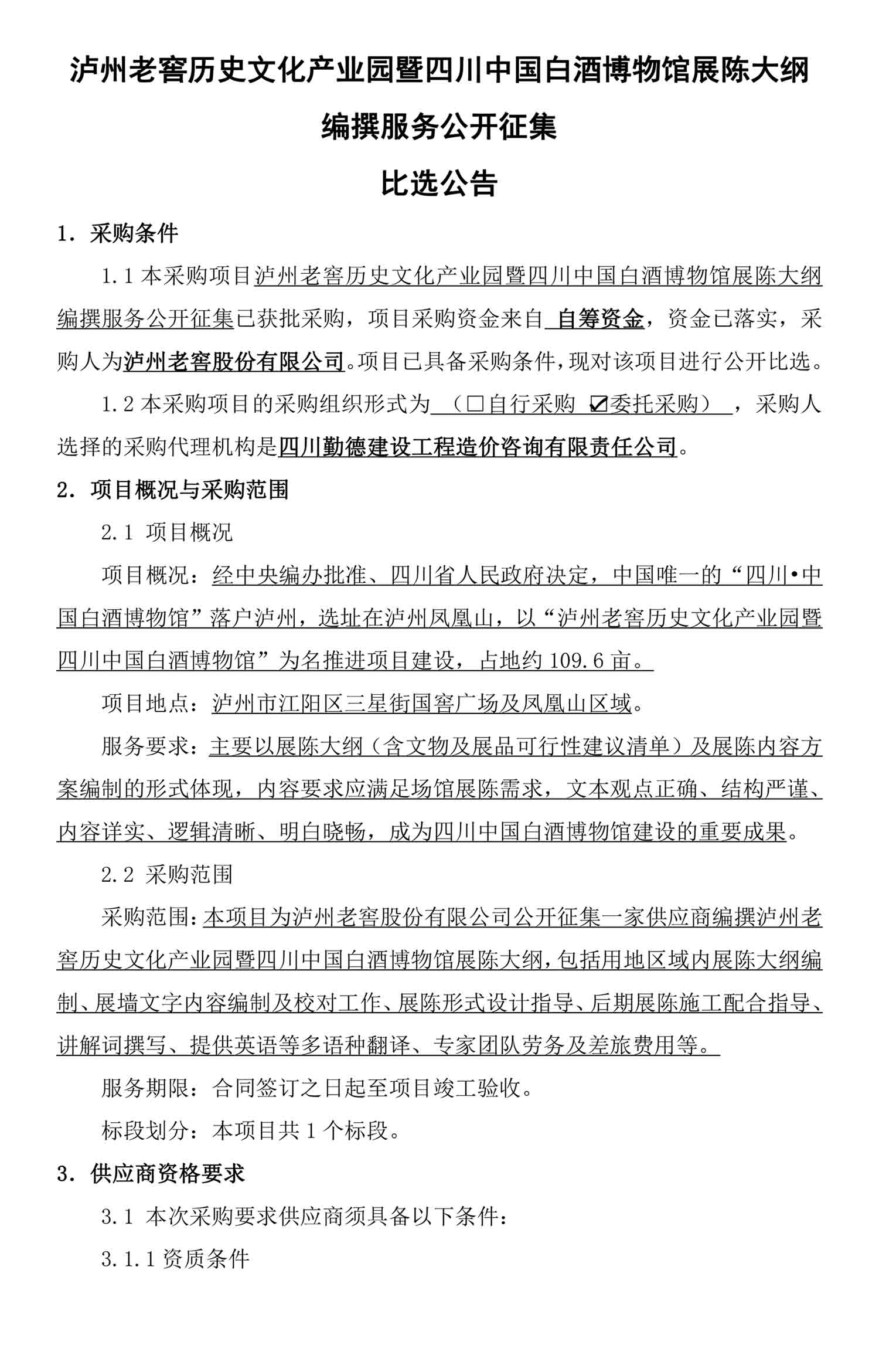 泸州老窖历史文化产业园暨四川中国白酒博物馆展陈大纲编撰服务公开征集比选公告