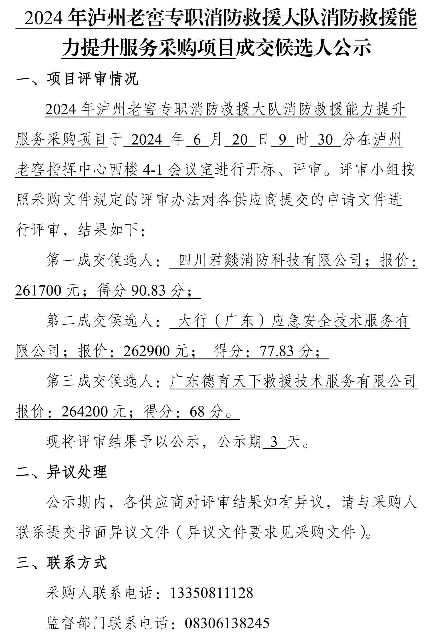 2024年泸州老窖专职消防救援大队消防救援能力提升服务采购项目成交候选人公示