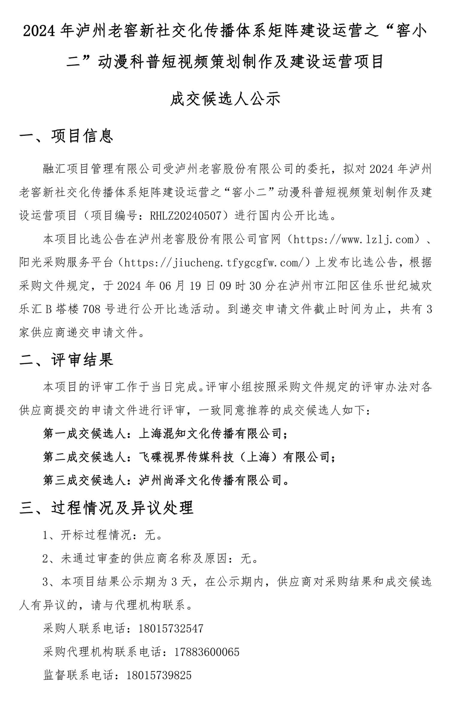 2024年泸州老窖新社交化传播体系矩阵建设运营之“窖小二”动漫科普短视频策划制作及建设运营项目成交候选人公示