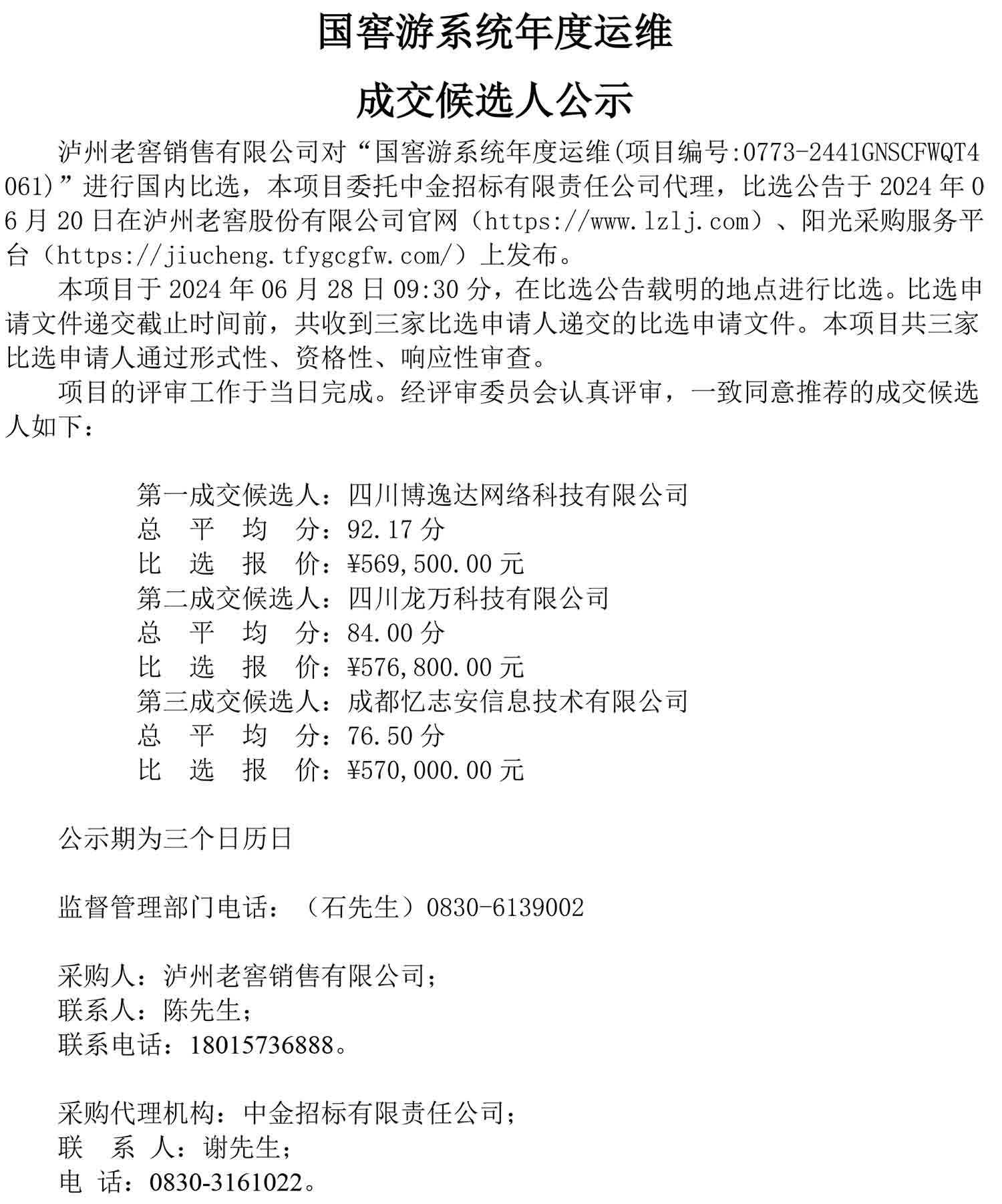 国窖游系统年度运维成交候选人公示