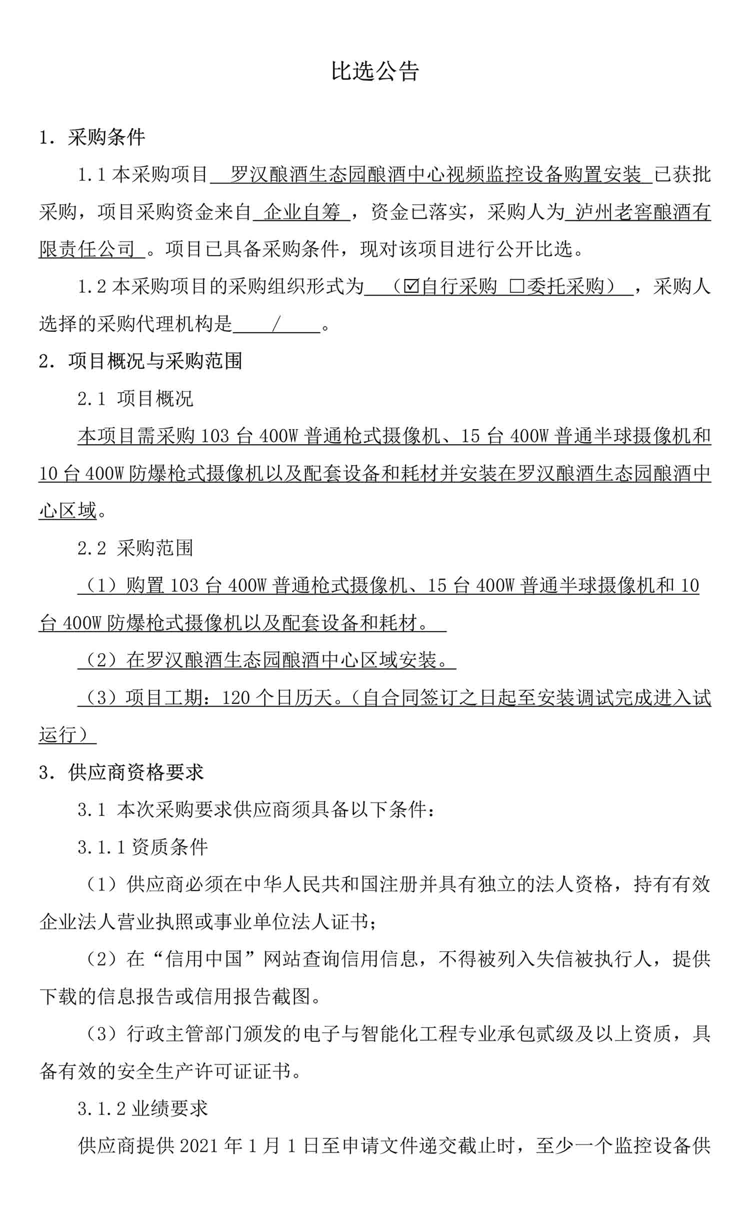 罗汉酿酒生态园酿酒中心视频监控设备购置安装比选公告