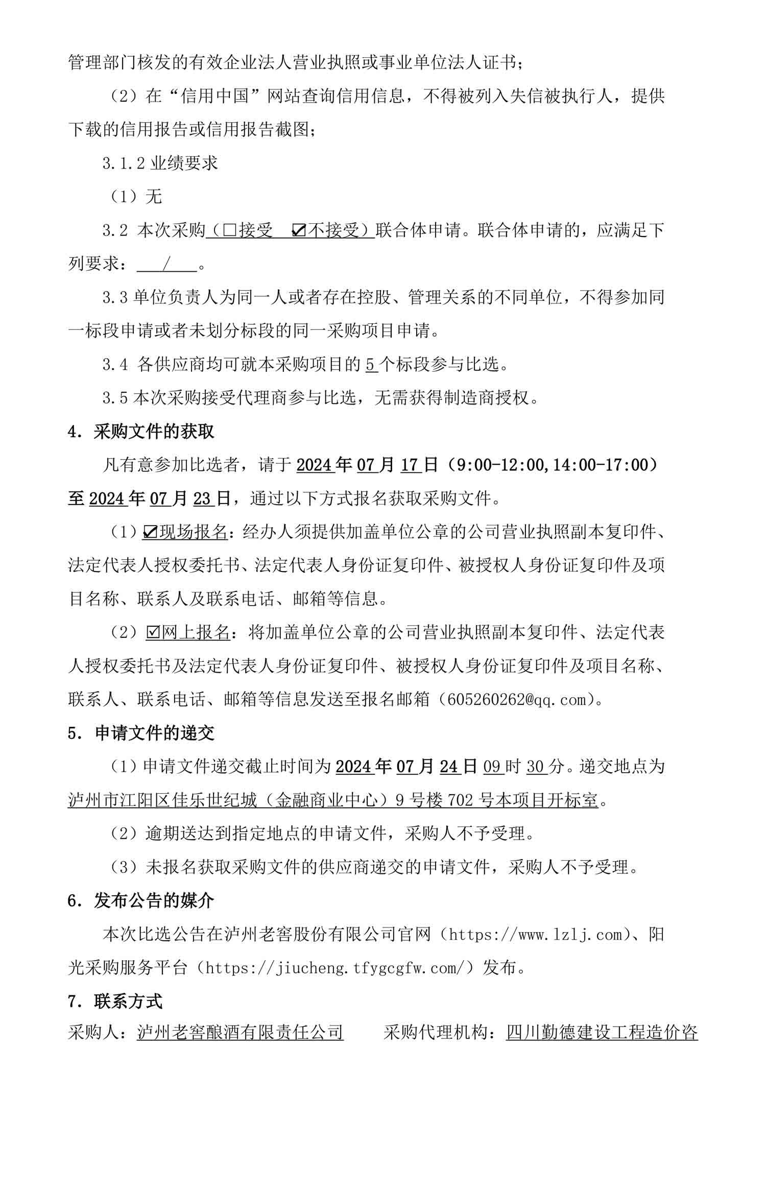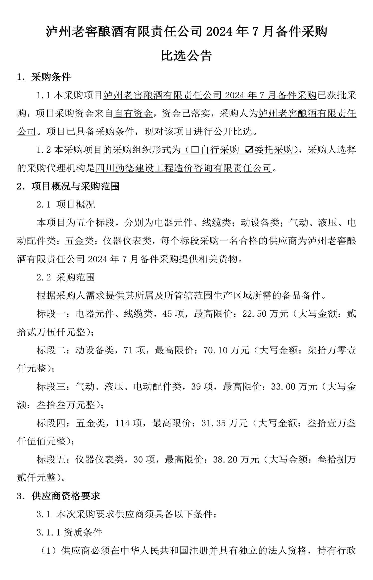 泸州老窖酿酒有限责任公司2024年7月备件采购比选公告