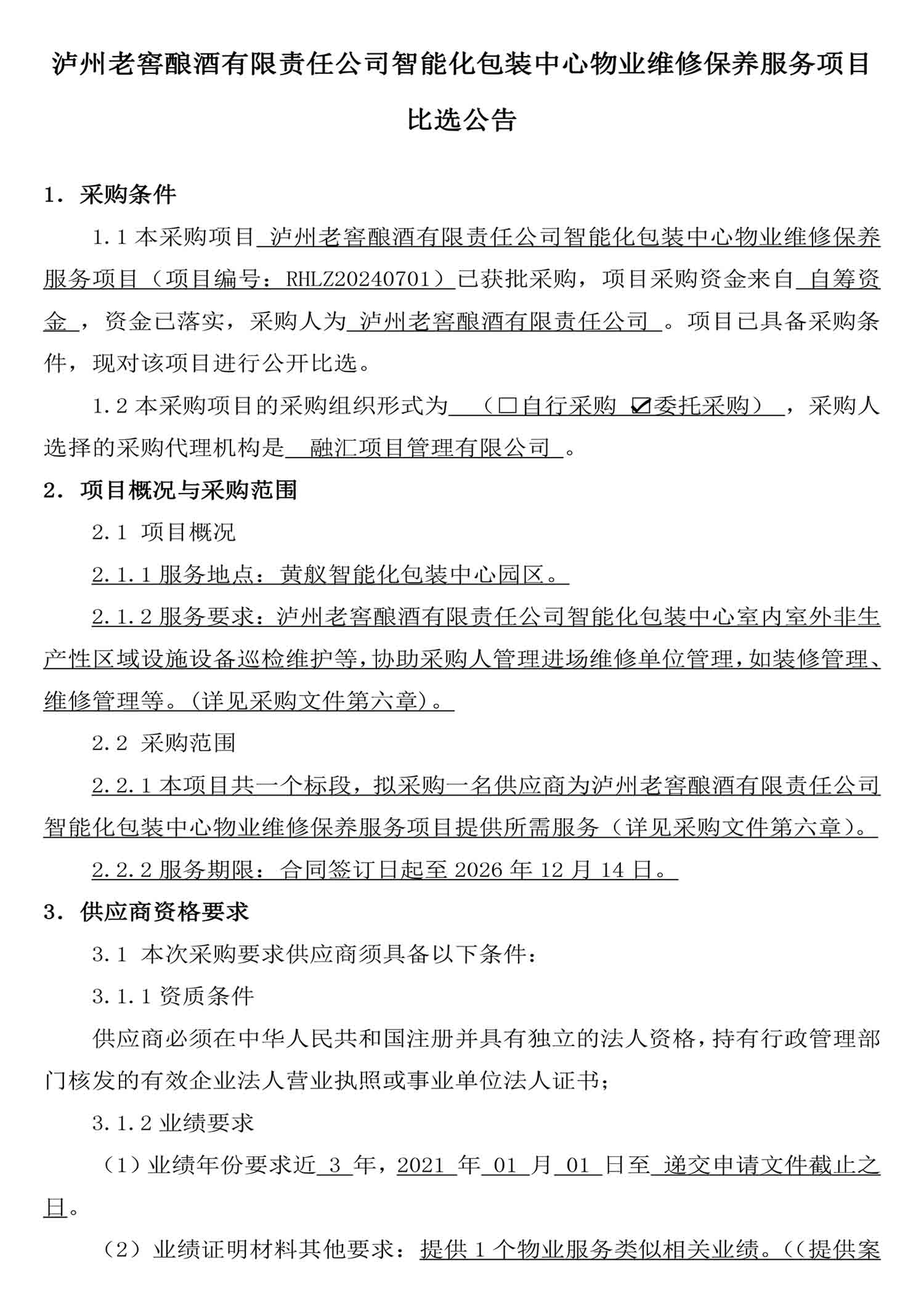 泸州老窖酿酒有限责任公司智能化包装中心物业维修保养服务项目比选公告
