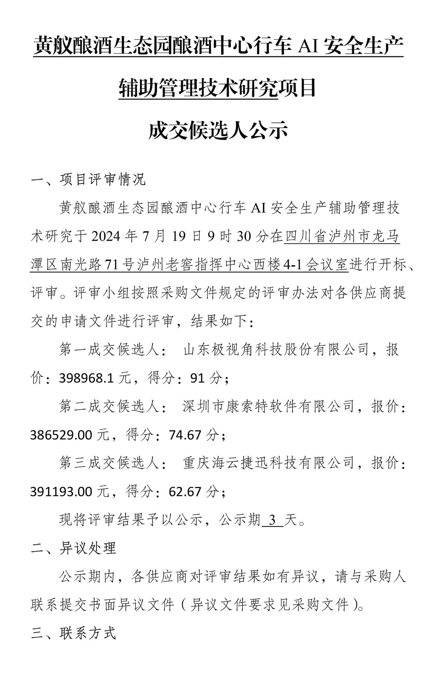 黄舣酿酒生态园酿酒中心行车AI安全生产辅助管理技术研究成交候选人公示