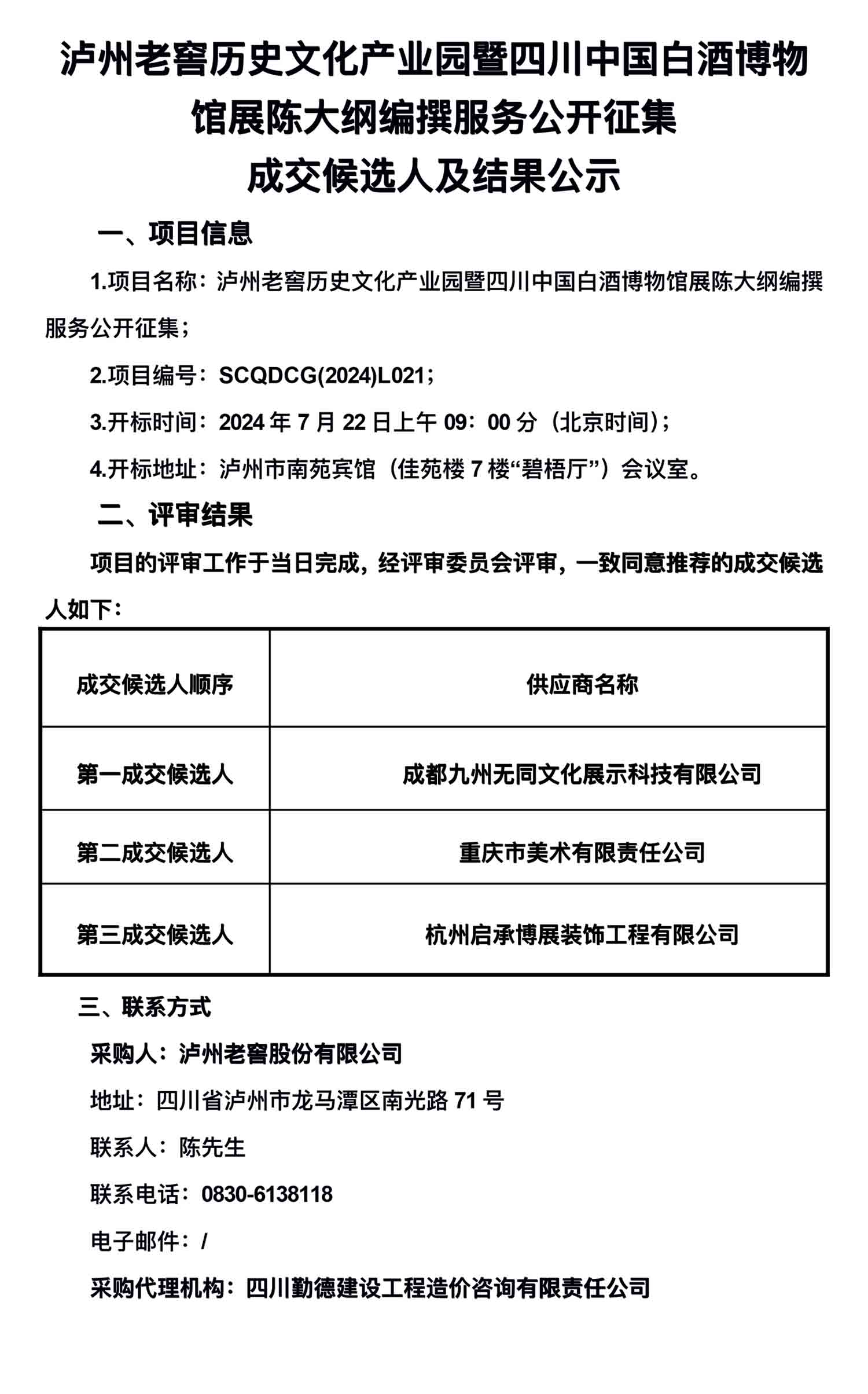 泸州老窖历史文化产业园暨四川中国白酒博物馆展陈大纲编撰服务公开征集成交候选人及结果公示
